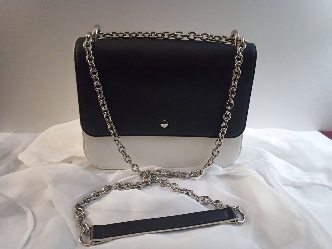 For your consideration is a very gently used medium size crossbody handbag by Chelsea28. It has a chain with a faux leather shoulder strap. Made with very firm, durable faux leather in black and white. Magnetic snap closure. Exterior slip pocket with magnetic closure. Interior has one slip pocket across from one zippered pocket. Extremely clean inside and out. Doesn't show any damage / wear but shows some very faint marks on the back as seen in the last two photos. I think it's actually slightly faded color. Measures: (inches) 10 wide 7.75 tall 3.75 deep 31" strap drop Stored smoke-free away from pets & cooking. π» Pick up in Lake Forest. (Trabuco/Lake Forest Dr.) No holds (without deposit or payment). No personal delivery included. May consider delivery locally for a small fee. π¦ Shipping available. Just message me with your zip code for a discounted shipping quote. IF IT'S UP, IT'S AVAILABLE β Let me know when you'd like to make this yours.