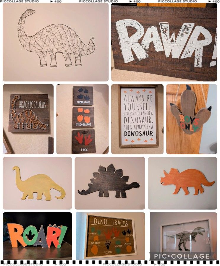 🦖 Dinosaur Wall Art Bundle – Hobby Lobby + Large Wire Dino 🦕 Create the perfect dinosaur-themed bedroom or playroom with this adorable dinosaur wall décor bundle! A mix of rustic wood signs, fun quotes, and statement pieces — all in great condition. Included in this lot: 🦕 Large wire dinosaur wall art (statement piece!) 🖼️ Hobby Lobby dinosaur wall art (wood silhouettes & framed pieces) 🦴 Dinosaur footprint wall signs (T-Rex, Triceratops, Stegosaurus) 🚪 Dinosaur door hanger (“Boys Only”) 🦖 “ROAR!” freestanding sign (stands on its own) 🧩 Mixed dinosaur sayings & themed décor (see photos) Style: Rustic / farmhouse / kids dinosaur theme Condition: Gently used, no damage Perfect for: Nursery, toddler room, kids bedroom, playroom, or dinosaur-themed space ✨ Selling as a bundle – not separating at this time 📍 Porch pickup / local meetup