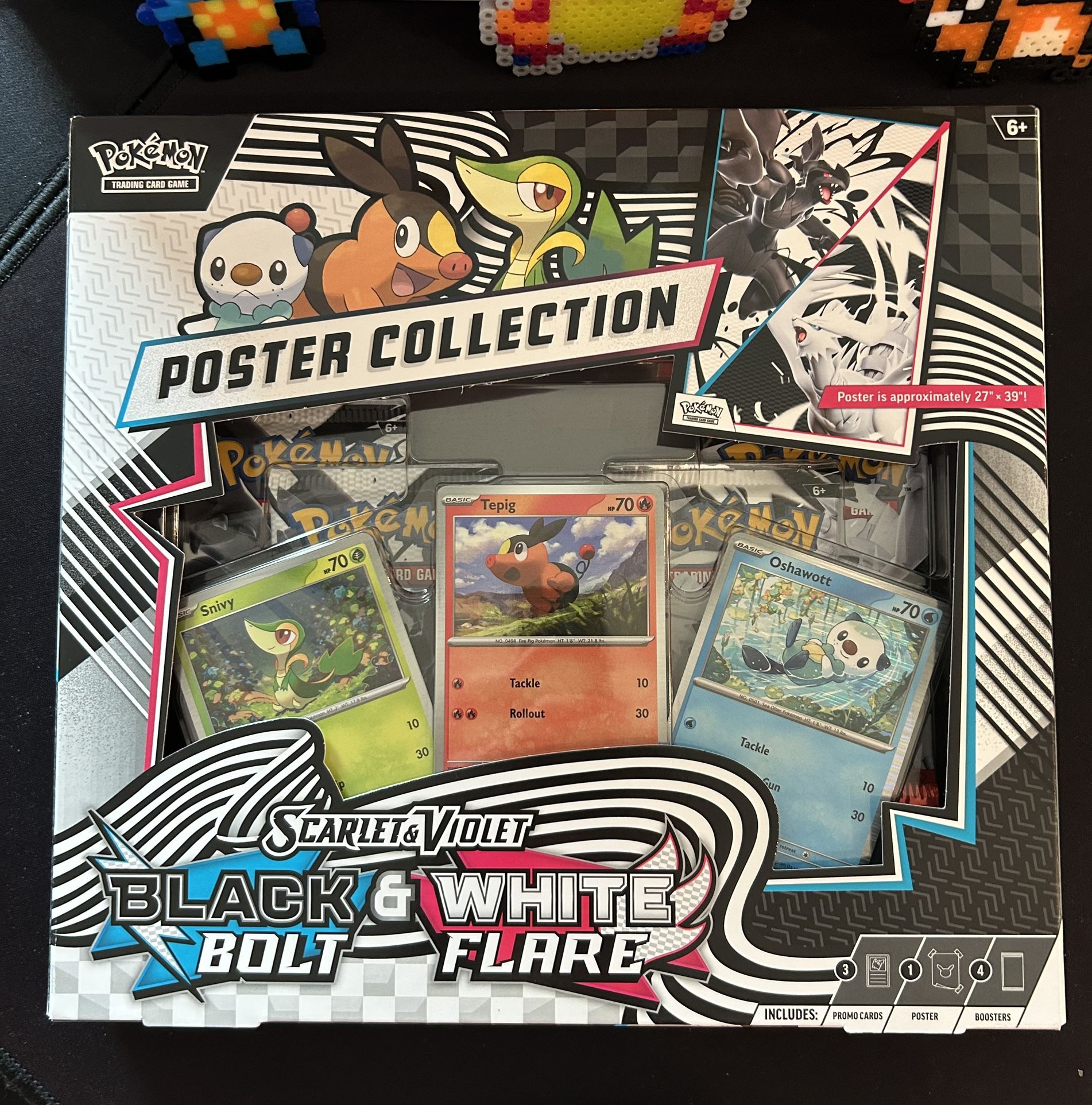 Brand new sealed Pokémon Scarlet & Violet Black & White Bolt and White Flare Poster Collection. Includes oversized poster, three promo cards featuring Snivy Tepig and Oshawott, and booster packs. TCG, VMAX, V, EX, Gold, Rainbow, Alternative Art, Full Art, Rare, Ultra Rare, Holo, PSA 10, Charizard, Rayquaza, Scarlet & Violet ETB, Surging Sparks ETB, White Flare ETB, Black Bolt ETB, Shining Fates ETB, Journey Together ETB, Paradox Rift ETB, Destined Rivals ETB, Shroud Fables ETB, Prismatic Evolutions, Evolving Skies, Jungle, Base Set, XY, Sun and Moon, Mega Evolution, Dragon Pokémon, Stellar Crown Booster Pack, 151 Booster Bundle, Collector Set, Pokémon Accessories, Elite Trainer Box