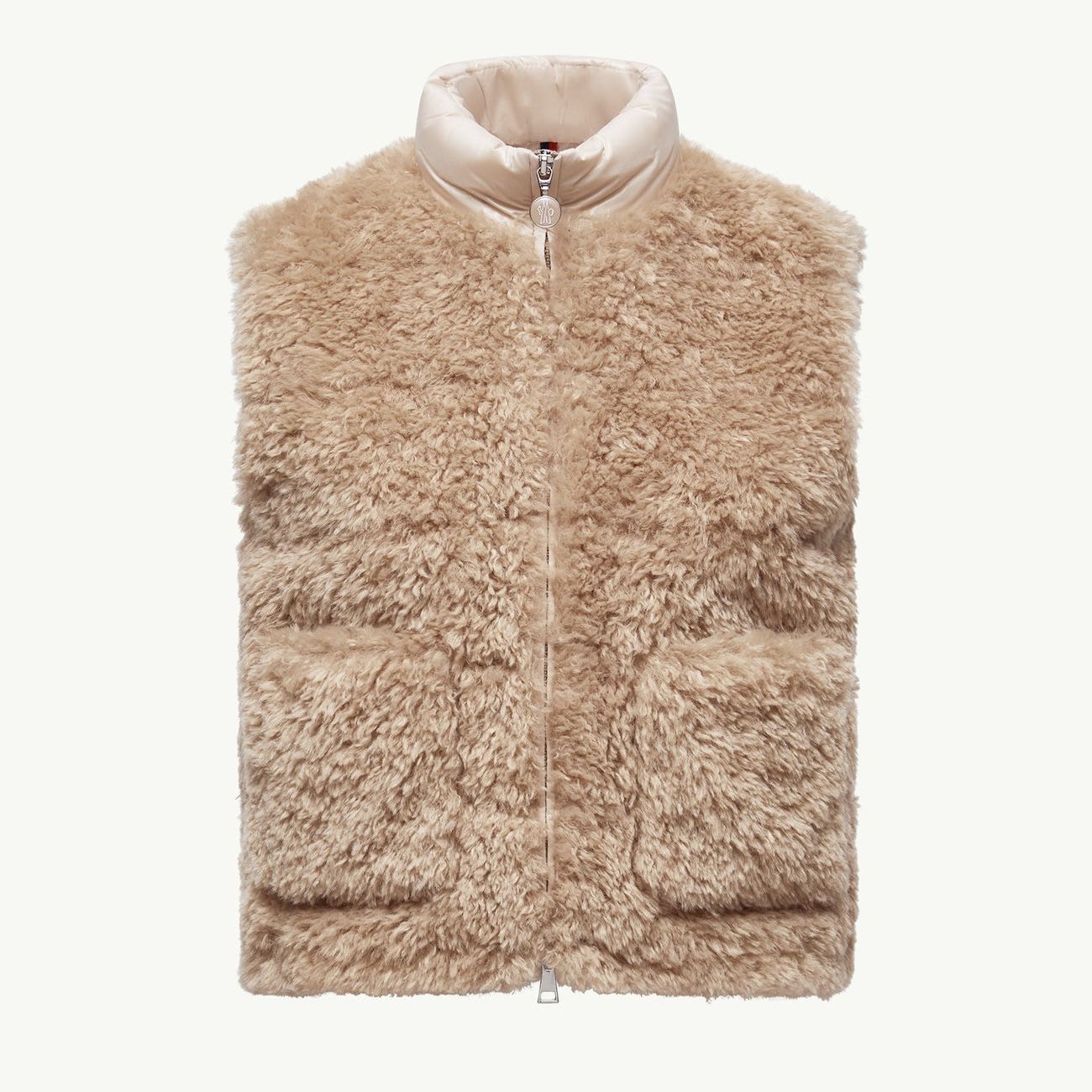 Excellent condition. The original price is $1590. Super cute. Crafted from a mix of teddy and glossy nylon laqué, the Planeze down vest for women plays with different textures.