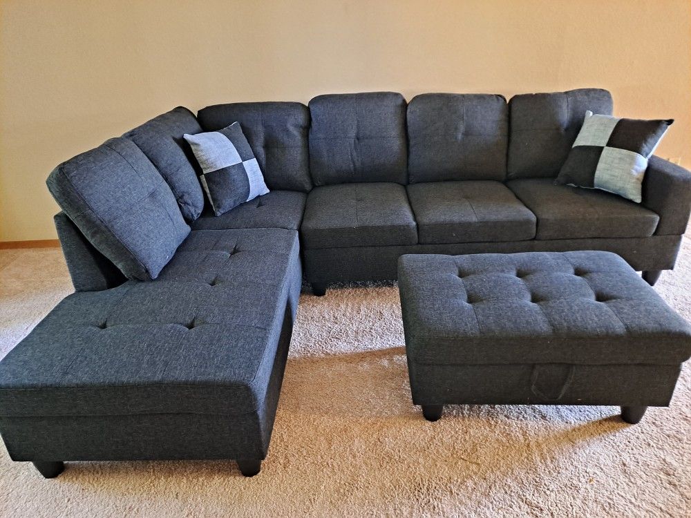 New Charcoal Linen Sectional W/ storage Ottoman At only $700 ( NEW IN BOX. ) " Free local delivery " Overall Dimension:103"L x 74"W x 35"H; Sofa: 71.5" x 32" x 35"H Chaise: 74.5" x 32" x 35"H Ottoman: 37" x 24.5" x 16.5"H