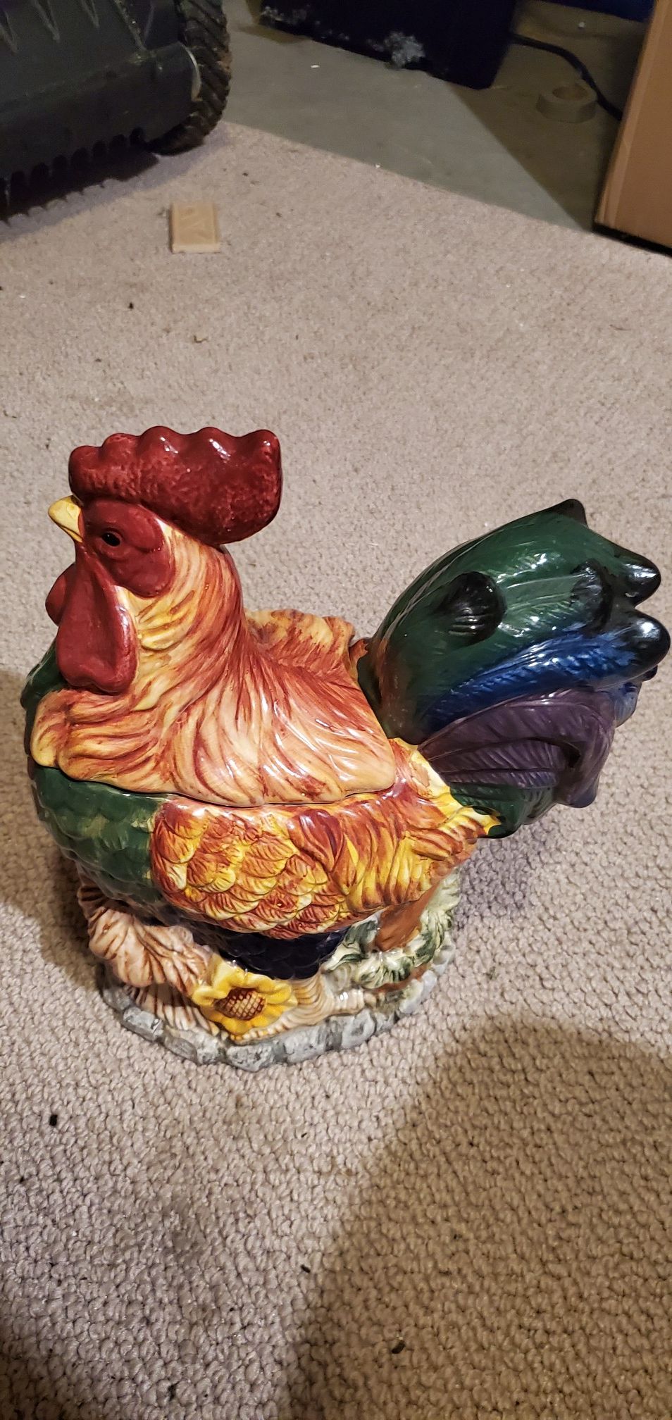 Two very beautiful roosters finished with glaze. Never used. The heads open to store things if desired. $8 for the large rooster, $6 for the smaller one, and $12 for both.