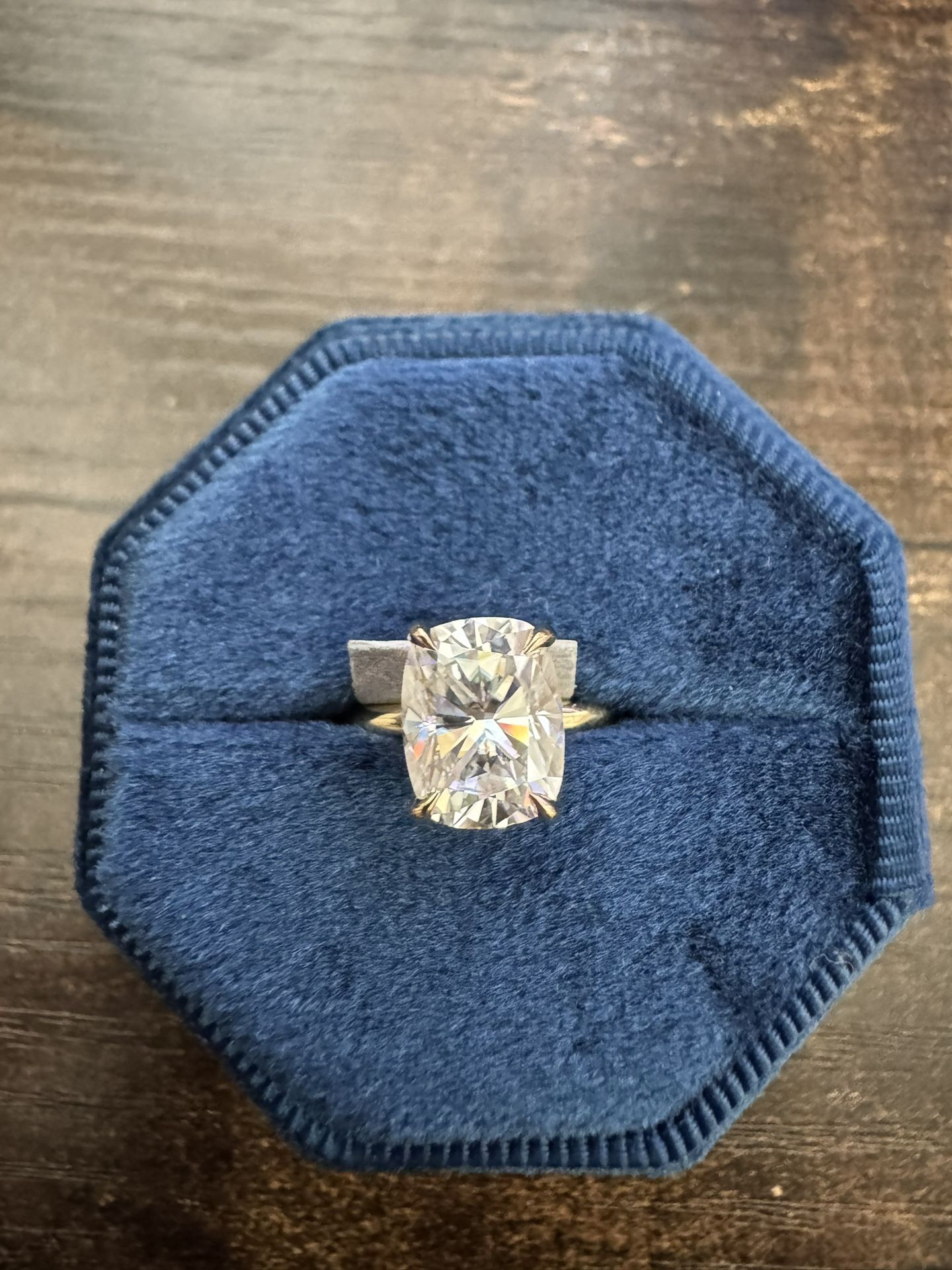 Size: 2.5 carat Shape: elongated cushion Band: 14K gold size 5 Has hidden halo Brand new condition. Only been taken out of carrier once to look at band. $2000 OBO. Requires $500 deposit before meeting up. Cash or zelle only.