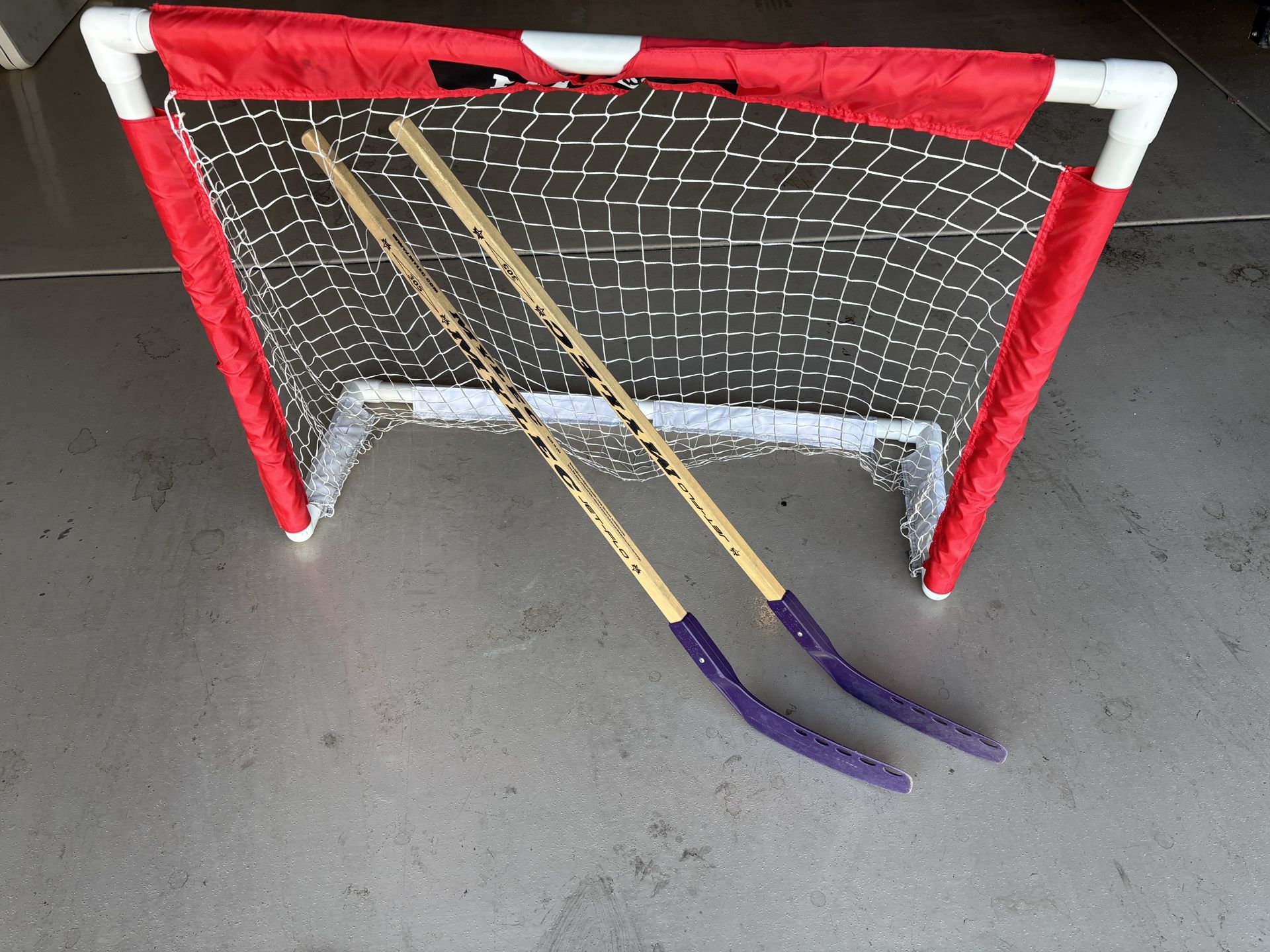 ALL IN ONE ULTIMATE STARTER SET: When the ice melts keep on playing! This all in one starter set includes (1) 46" PVC hockey goal, (2) street hockey sticks and (3) street hockey balls GREAT FOR YOUTH HOCKEY PLAYERS: Designed for youth hockey players who want play the game with friends in the driveway, with this youth set the fun never has to stop! LIGHTWEIGHT AND PORTABLE: This set is constructed from lightweight PVC to easily assemble or break down to take on the go in seconds; The lightweight design makes this goal easy to assemble, move and store! DURABLE PRE-FIT NET: Durable all weather polyester mesh net has been pre fitted for quick and easy assembly Net is in great condition, the sticks show gentle wear.