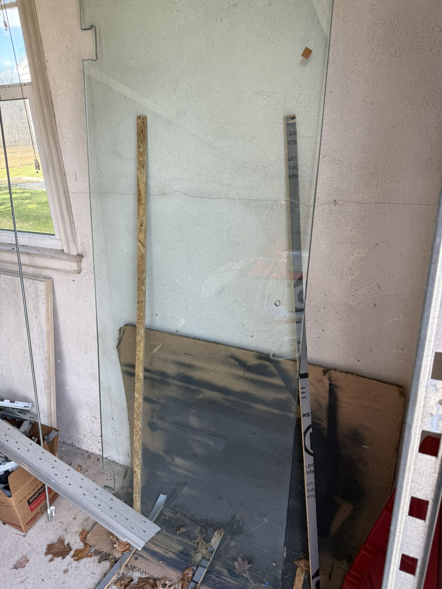 28”x73.5” glass door. 3/8” thick door has hinges and door handle holes already drilled tempered glass was delivered wrong size and a new one was made. Free to anyone who wants it. $2000 retail. If your building a shower you can have side panels made