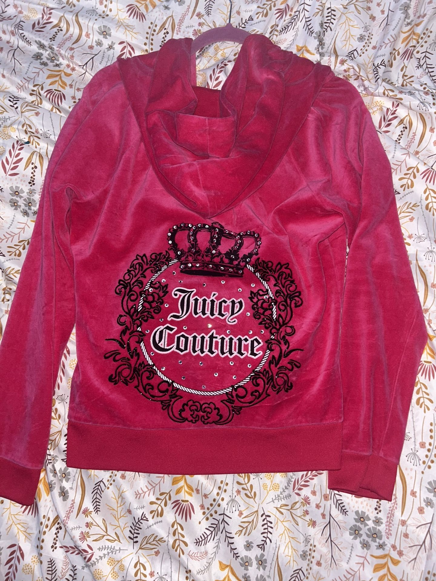 Y2K Vintage Juicy Couture Hot Pink Velour Zip-Up Hoodie Jacket Rhinestone Crown