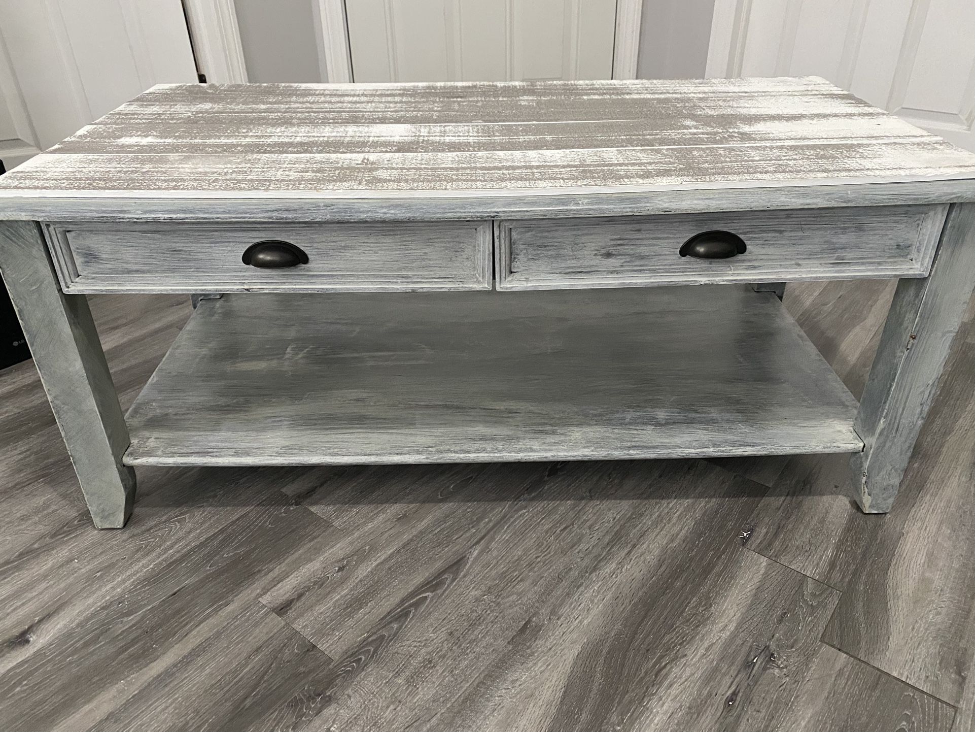 Refurbished gray and white sturdy coffee table. Made with good wood. Pick up from 3rd floor. You’ll need 2 people as it is heavy wood. Contact me to pick up. Moving and need gone.