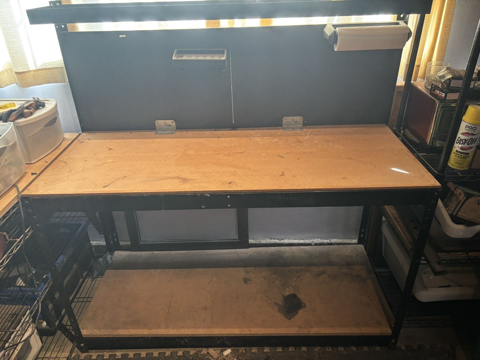 Heavy-duty workbench / craft workstation with solid wood top and steel frame. Large main work surface with a lower shelf for storage. Includes an overhead mounted light bar, paper towel holder, and rear panel for mounting tools or accessories. Very stable and sturdy, suitable for workshop use, crafting, electronics, art projects, or general utility work. 60 x24 work table Used condition with visible surface wear, stains, and marks from normal use. Structurally sound and ready to use as-is. It will be disassembled for easier transport.