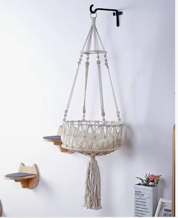 I’m selling this Macrame Cat Swing. While my cat loved it (see photos) she is now close to 15 lbs and no longer fits. It has been one of her favorite toys. She loved running and jumping into it and spinning around.