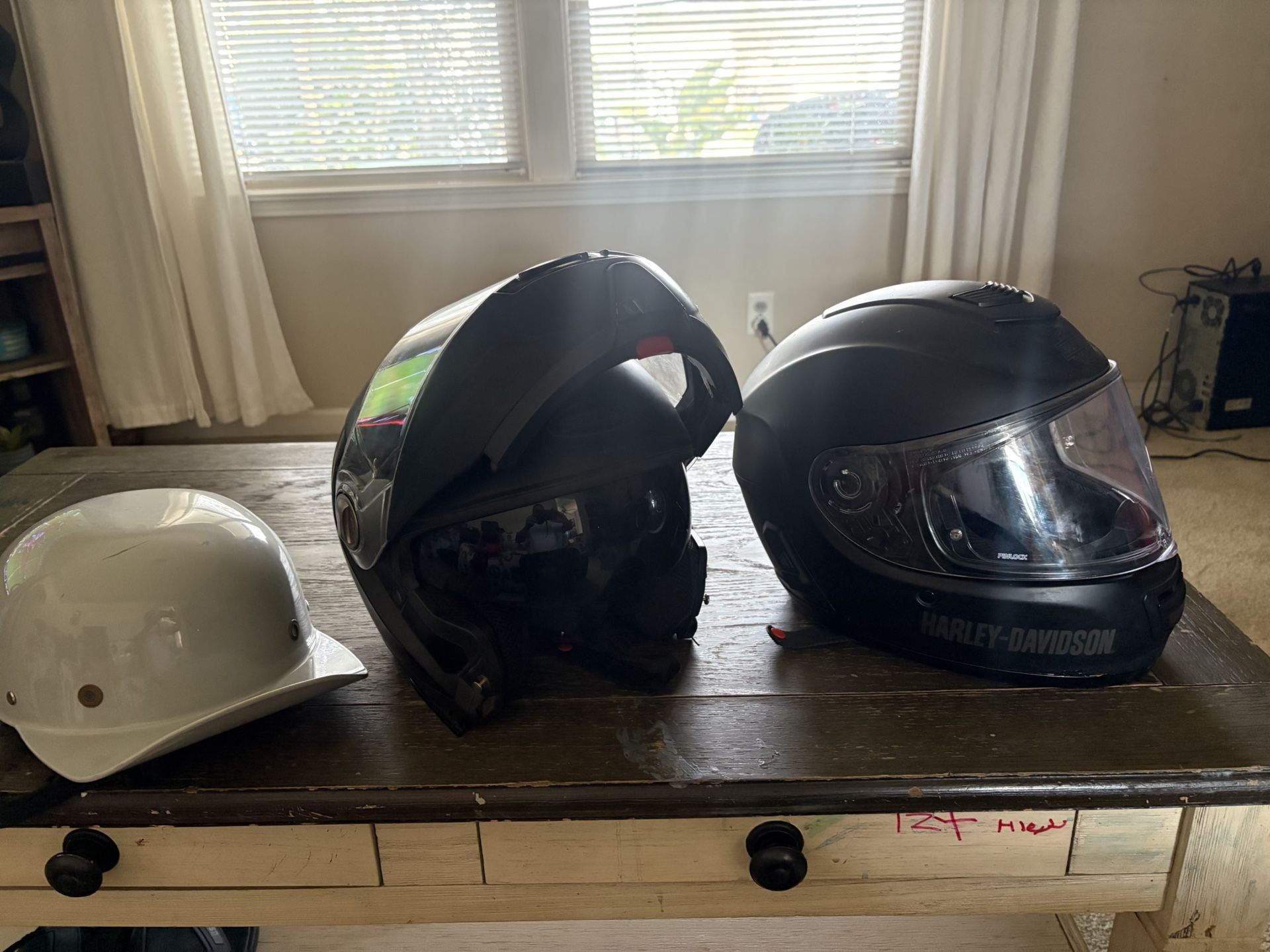 Motorcycle helmets in excellent condition. Harley Davidson Bluetooth helmet size medium 150$, white baseball cap helmet size medium 60$ , full face flip up helmet size. Xl 125$