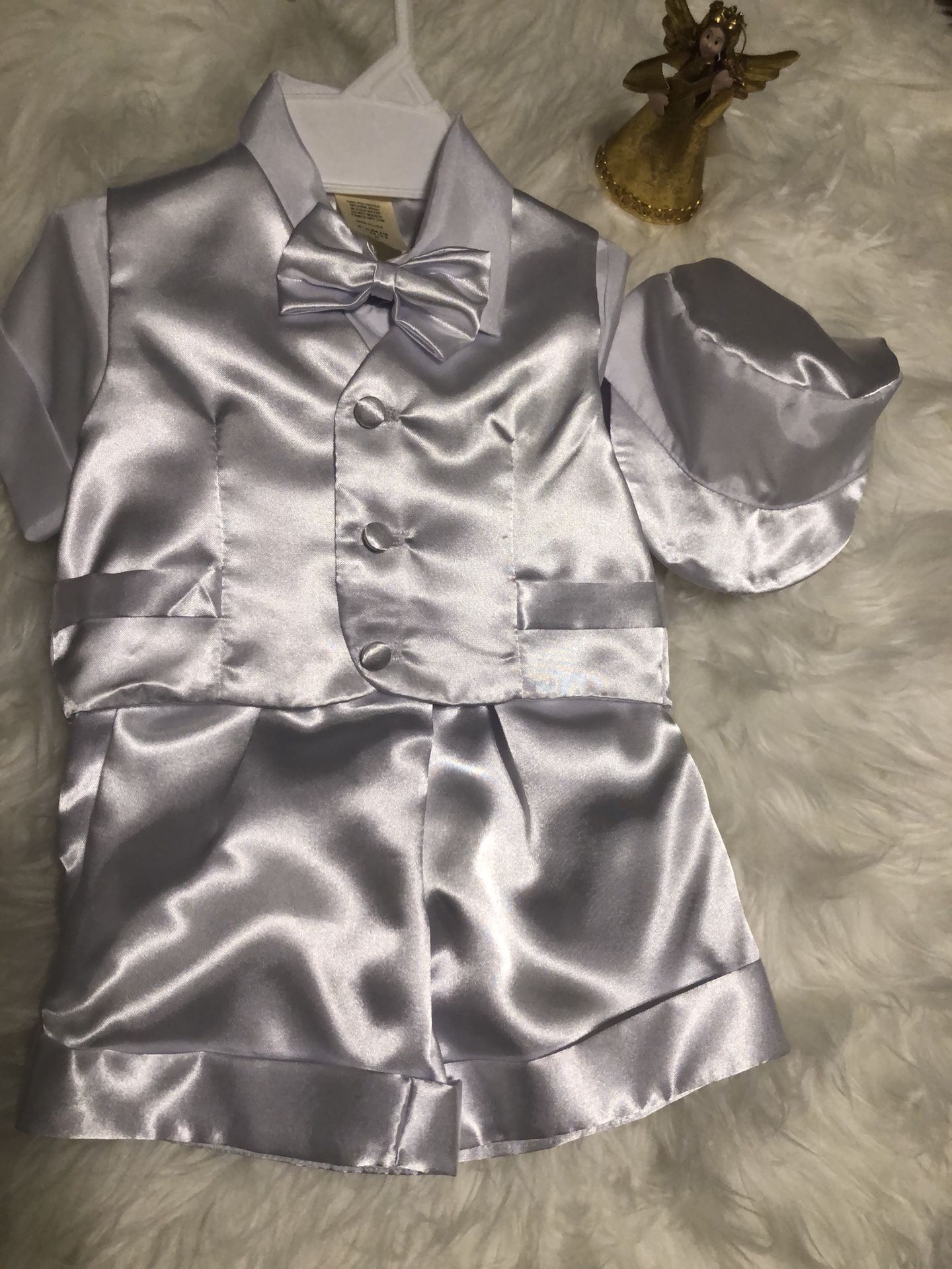 5-piece short set. It includes: shirt, vest, shorts, bow tie, and cap. Ideal for christening, baptism, or weddings!