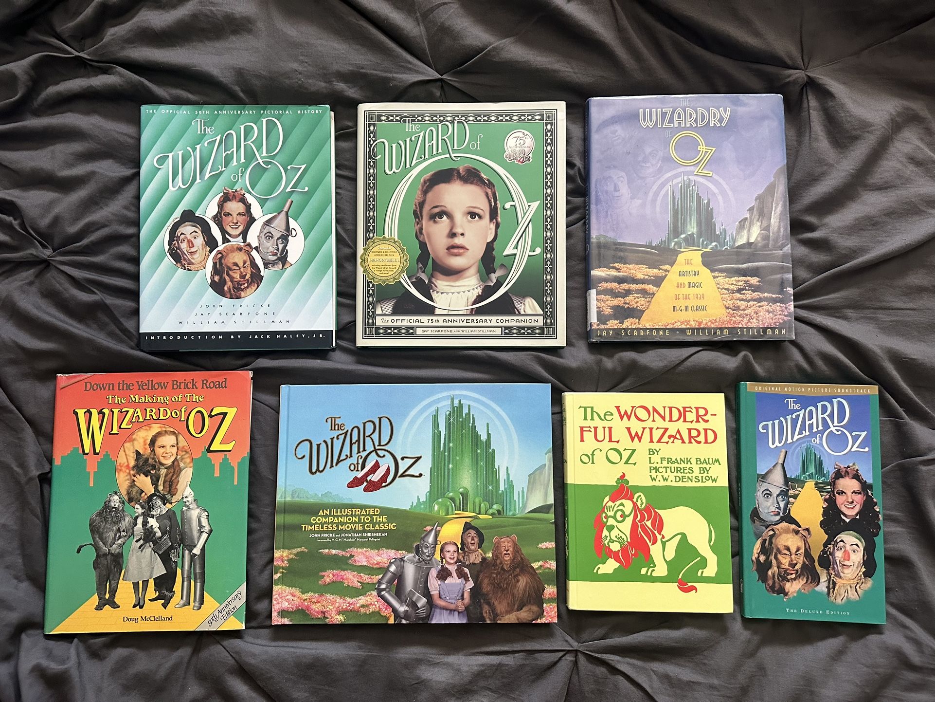 6 Hardcover Wizard of Oz books including: The official 50th anniversary pictorial history The official 75th anniversary companion The wizardry of oz Down the yellow brick road: the making of the woz An illustrated companion to the timeless movie classic 100th anniversary edition of “The Wonderful Wizard of Oz” The Wizard of Oz Original Motion Picture Soundtrack and Book. (1995)