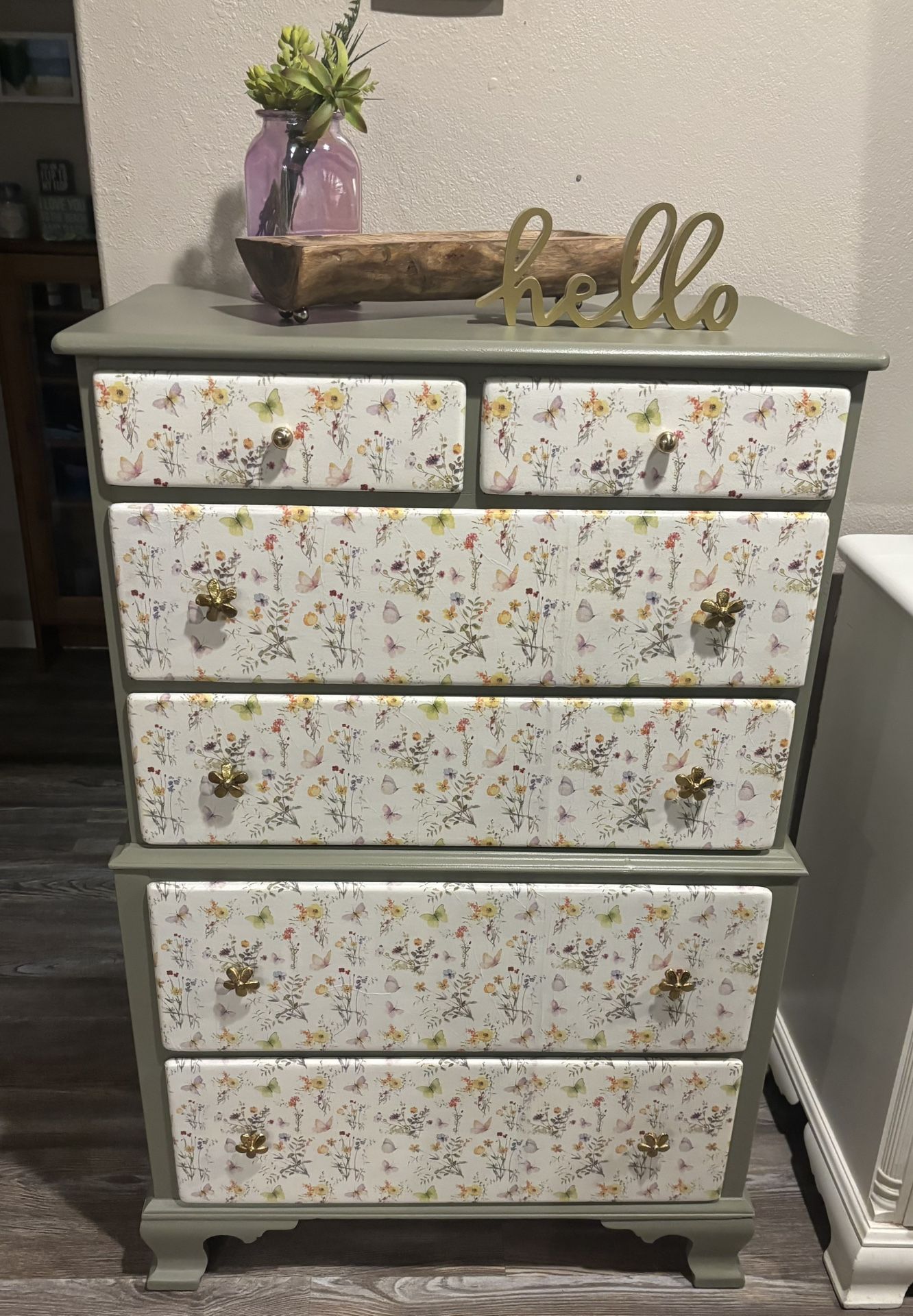 Sweet refinished chubby chic dresser. Painted sage green, with a whimsical touch on drawers…lovely wildflower rice paper with durable decoupage finish. Truly brought this back to life with a cute vibe for any space😊 $235 obo