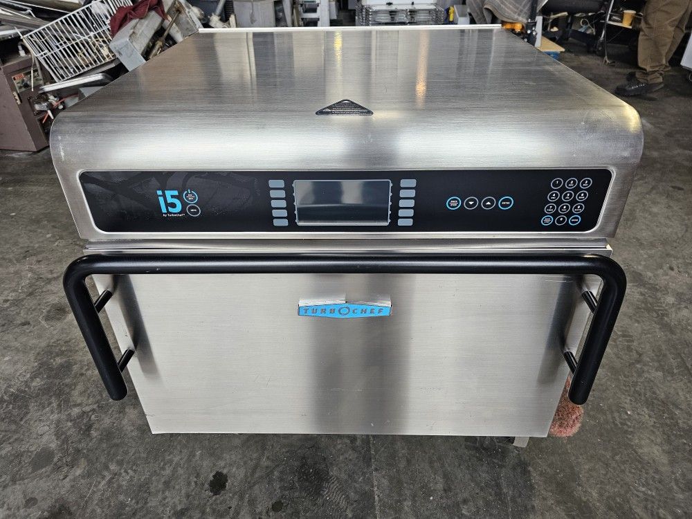 TurboChef i5 Electric Countertop Rapid Cook Ventless Oven 208/240v 1ph Tested Year 2019 Description TurboChef i5 Electric Countertop Rapid Cook Ventless Oven with One Touch Controls - 208/240V, 1 Phase with New front bottom cover. (TurboChef I59282 Cover Front) Manufactured date: Aug. 2019 TurboChef I5-9500-814-DL Details This TurboChef i5 Touch high-speed electric commercial convection microwave oven uses a finely-tuned combination of independently controlled dual motors, high-speed air impingement, and microwave technology to cook various foods at a much faster and more even rate than traditional ovens, without sacrificing the taste and quality your customers expect! Whether you need to make subs, breakfast sandwiches, muffins, or even pizza, this model is sure to meet your high demands. It features a catalytic converter to limit smoke, grease, and odor emissions so that you don't need to worry about a costly hood installation, making it an excellent choice not only for convenience stores and sandwich shops, but also for airports and other operations where an exhaust hood may not be practical. This high-speed countertop oven boasts simple, intuitive touchscreen controls that allow you to store up to 200 recipes so you can offer a diverse menu with guaranteed consistency. Creating and managing your recipes couldn't be any easier thanks to the USB port that allows you to create and tweak recipes on your computer and upload them directly to the oven. To help you get the most out of your new rapid cook microwave oven and keep it running at peak performance, built-in self diagnostics help you troubleshoot and Smart Voltage Sensor Technology automatically detects and adjusts to the proper voltage during installation. For easy cleaning, the unit features an all stainless steel construction with a removable grease collection pan and rack that can be quickly washed in the sink at the end of a busy shift. To provide you with the most helpful accessories to ease your cooking experience, this oven comes with an aluminum paddle, a bottle of oven cleaner and oven guard, 2 trigger sprayers, and 2 PTFE baskets. This oven requires a 208/240V, 3 phase electrical connection. Overall Dimensions: Width: 28" x Depth: 28 1/4" x Height: 24 5/16" Interior Dimensions: Width: 24" x Depth: 14" x Height: 10" Capacity: 2.2 cu. ft. TurboChef i5 Specifications Spec Attribute Spec Value Manufacturer TurboChef Base None Color Silver Construction Stainless Steel Controls Touch Screen Depth (in) 28.25 Design Large Cavity Door Construction Solid Only Door Type Independent Heat Electric Height (in) 24.3 Hertz 60 Special Features Ventless Type Impingement/Microwave Voltage 208 / 240 Conditions Tetsted Works Good all fuctions. Width (in) 28.1