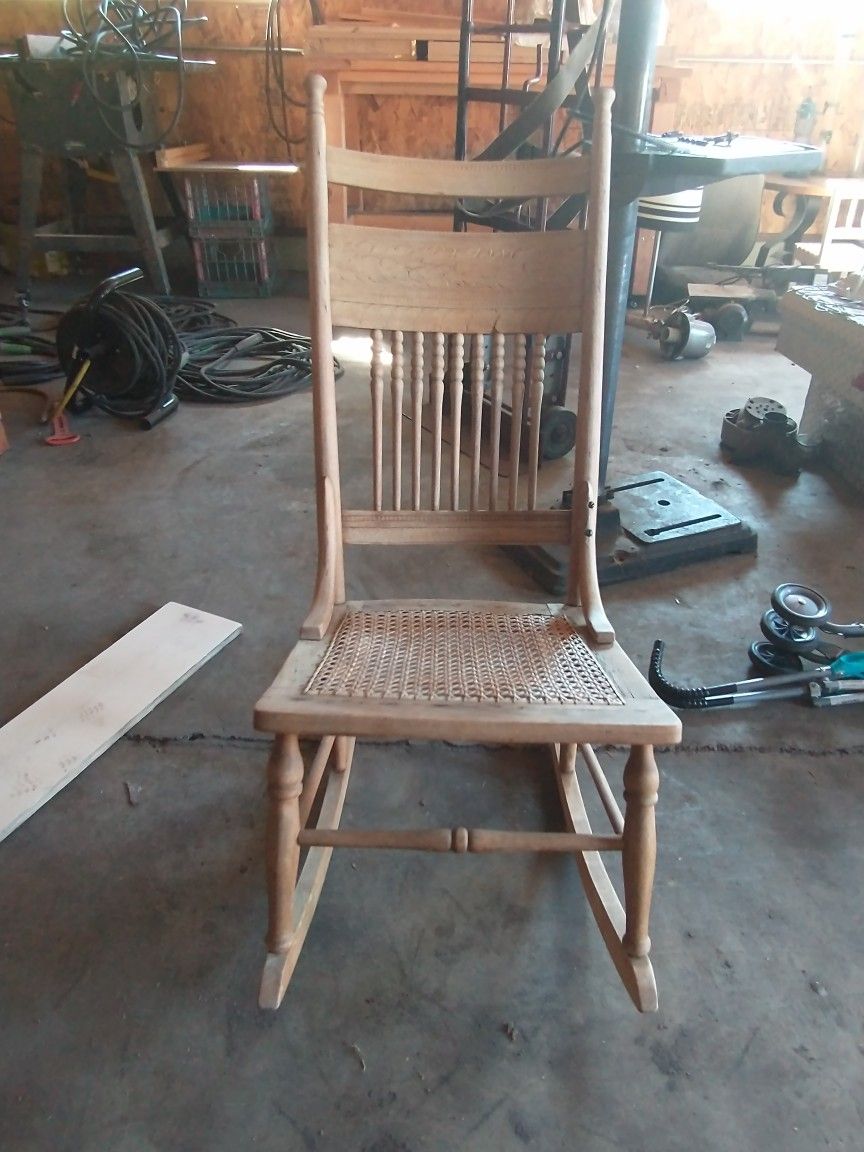 Rocking chair with floral detail and stitched seat. Would be beautiful refinished.
