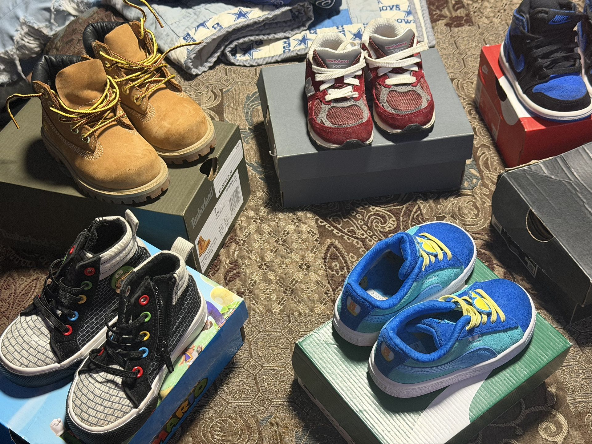 Some of the goes are 7C 8C 6C 5C Black / Brown Timberland ($65) each 7C Burgundy/ (7C) & Gray New Balance (6C) Nike Jordan’s ( black gold ) 6C ( Black and blue ) 6C Pumas ( 7C) Cocomelon Mario ( 7C) White uptowns ( 7C)