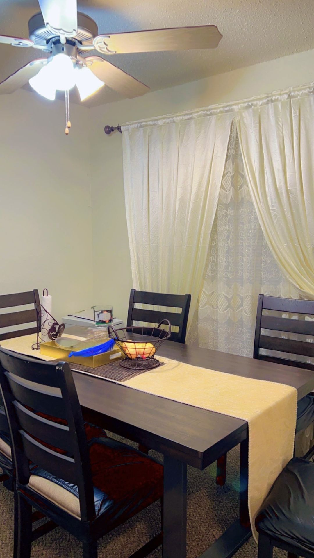 Dark wood dining table with 6 chairs. Strong, clean, and in good condition. Perfect for any home.