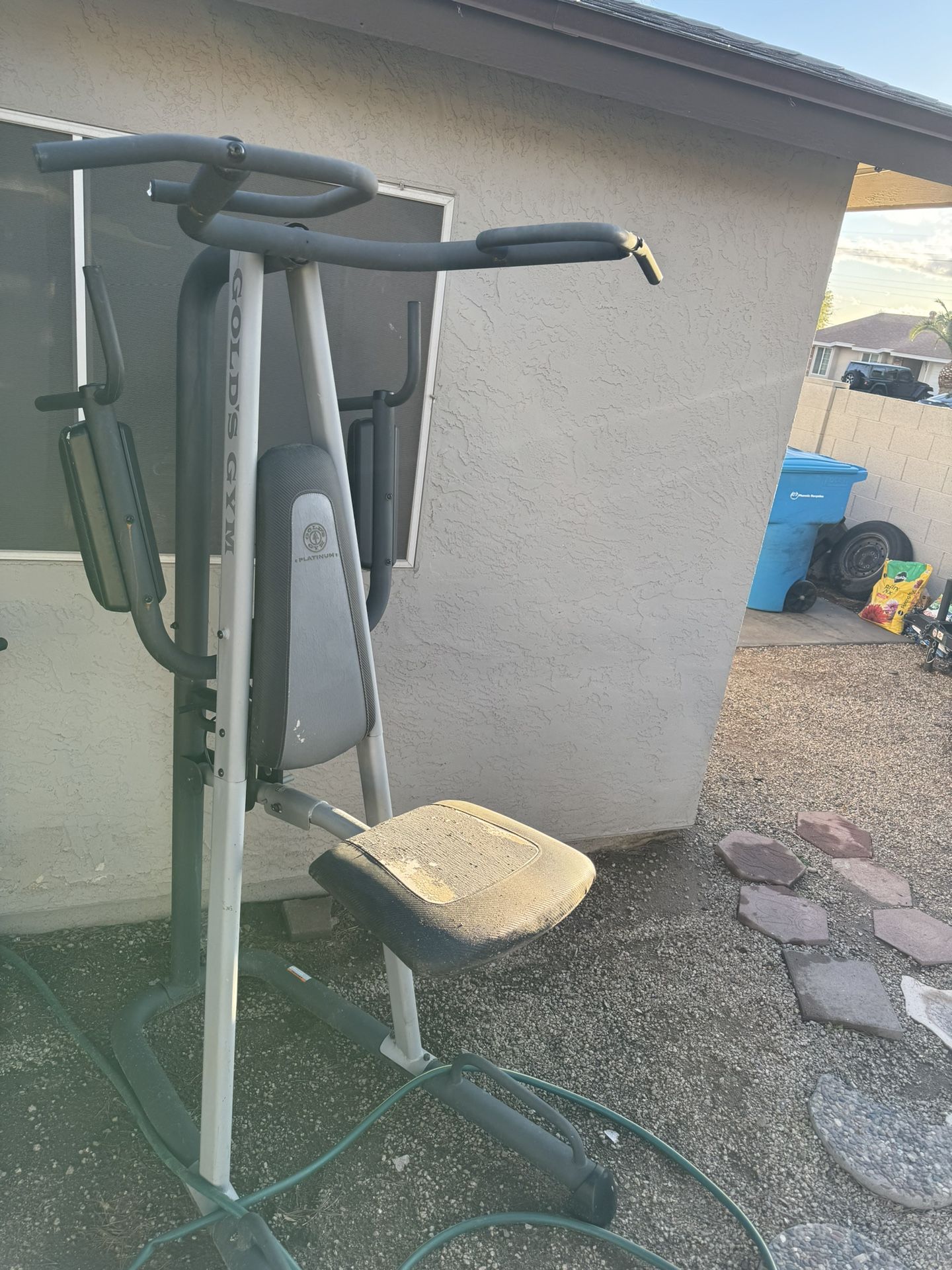 Golds gym assisted pull-up and dip machine. No delivery a little worn from sun but works as it should.