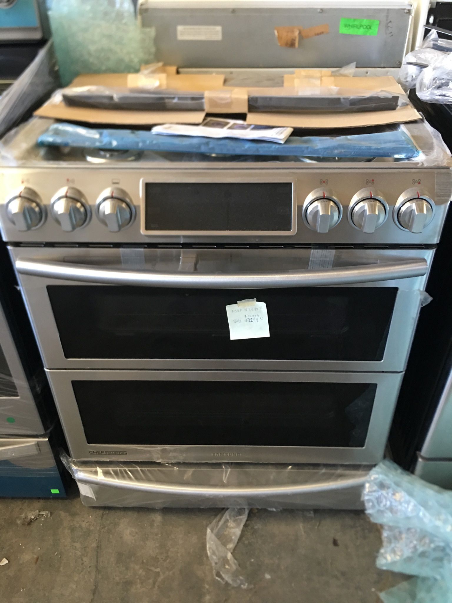 Samsung 5.8 cu. ft. Slide-in Dual Fuel Range with Flex Duo™ & Dual Door in Stainless Steel Model # NY58J9850WS/AA Retails price $2,399.00 My price $1,399.00 Deliver available Factory warranty Call 209…./…271….0336 Key Features DOWNLOAD SPEC SHEET PDF download Cooking System True Convection Flex Duo™ Yes Control Type Guiding Light UI Soft Close Door Yes Dual Door™ Yes Warming Drawer Yes True Convection True Convection Design Color Stainless Steel Configuration Slide-In Fuel Type Dual Fuel Cavity Type Double Controls for Oven Guiding Light UI Controls for Cooktop Stainless Steel Display Color ICE Blue Weights & Dimensions Product Dimensions 29 15/16" W x 36 3/16" H x 26 7/16" D Oven Dimensions 25" W x 20 25/32" H x 19 1/4" D Capacity Oven Capacity 5.8 cu. ft. (2.4 cu. ft. Upper / 3.3 cu. ft. Lower) Cooktop Total Power 61,000 Total Number of Burners 5 Burner - Left Front 15,000 BTU Burner - Left Rear 9,500 BTU Burner - Right Front 22000 BTU to 800 BTU Burner - Right Rear 5,000 BTU Burner - Center Rear 9,500 BTU Cooktop Material Gas stainless steel Cooktop Type Gas stainless steel Center Burner Type Oval Dual Power Burners Yes Sealed Burners Yes Matte Black Continuous Grates Yes Oven Convection Bake 175°F - 550°F Convection Roast 175°F - 550°F Bake 175°F - 550°F Variable Broil Low - High Total Number of Racks 3 Number of Split Racks 1 Number of Wire Racks 2 Number of Rack Positions 7 Included Accessories Griddle Yes (Cast Iron, Reversible) Wok Grate Yes Anti-Tip Bracket Yes Standard Features Drawer Type Warming (3 level) Kitchen Timer Yes Delay Start Yes Child Safety Lock Yes Sabbath Mode Yes Auto Oven Light Yes Interior Lights (qty) Incandescent 40W (2) Steam & Self Clean Yes (2-3-5 hrs) + SteamQuick 20 Custom Cook Yes