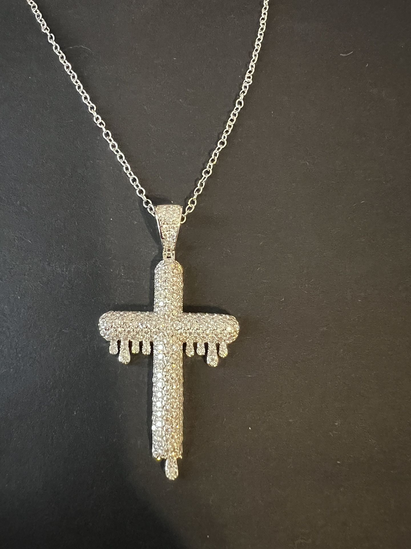 New Drip Cross Moissanite White gold Rhodium finish! Dripped cross style. It will come with a FREE silver filled chain!! Passed the diamond tester. Must pick up in McAllen.