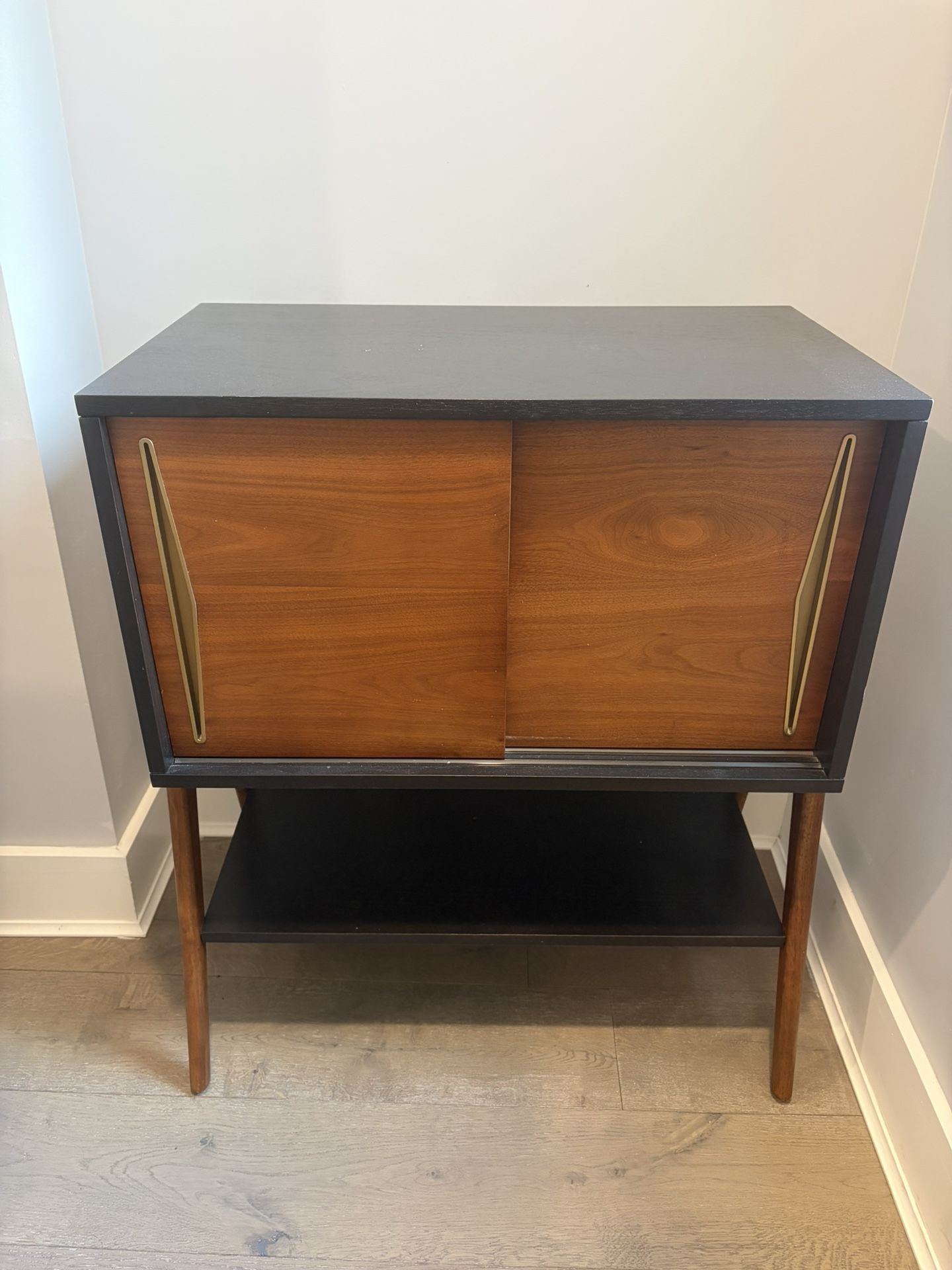 It’s a solid piece perfect for any small space ; I used it as an extra kitchen counter and bar rack storage and to store some pots and pans. Not wobbly. The left door is a little tough and probably needs from WD40 to get it smooth again. Otherwise no issues Measurements as in photos : width 28 in, depth 16.5 in, height 35 in