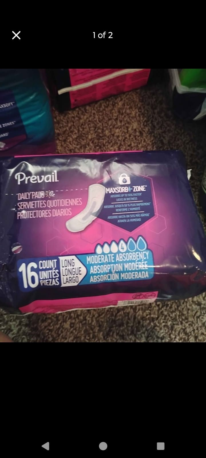 8 packs of prevail daily pads...used for incontinence or can be used for menstrual 16 pads per pack...total of 128 pads Long... moderate absorbency Located off parklane 40 dollars for all