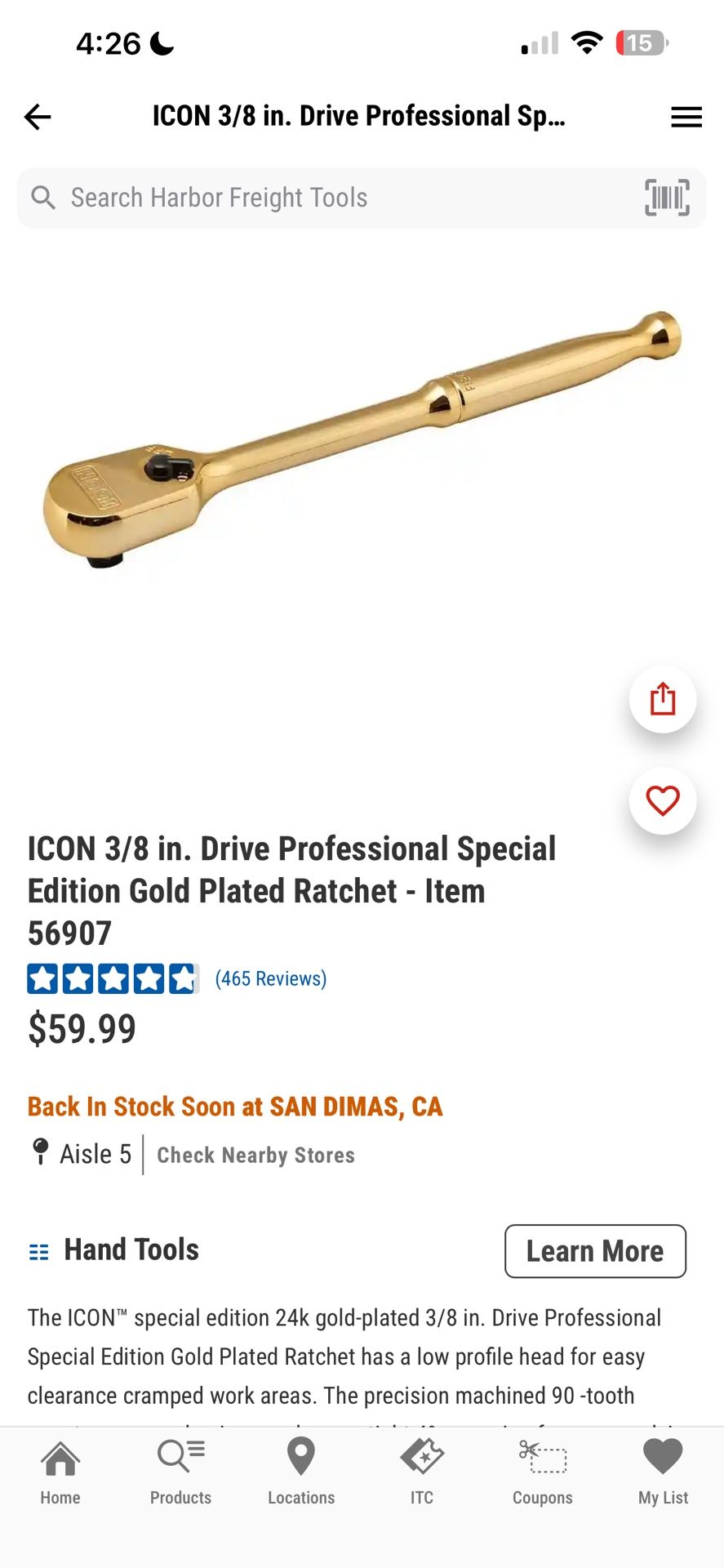 ICON 3/8 in. Drive Professional Special Edition Gold Plated Ratchet Retails for $60+tax selling for $42.00 The ICON™ special edition 24k gold-plated 3/8 in. Drive Professional Special Edition Gold Plated Ratchet has a low profile head for easy clearance cramped work areas. The precision machined 90 -tooth gear-to-gear mechanism produces a tight 4° arc swing for easy work in small places. This ratchet's polished finish offers superior corrosion resistance and easily wipes clean. This ICON™ professional tool is backed by a hassle-free, manufacturer's lifetime warranty.