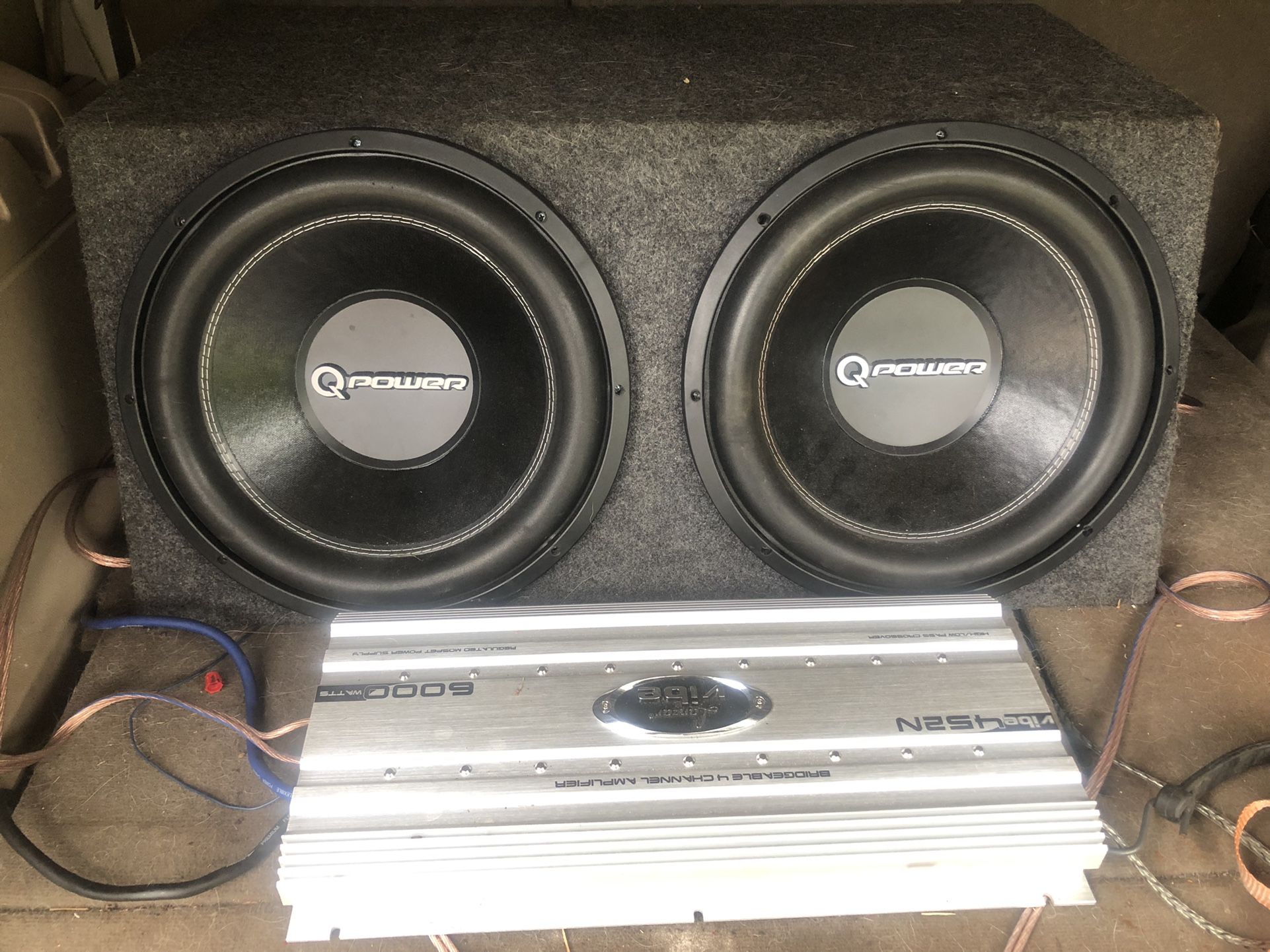 2 Q Power 15 Inch Deluxe Series Subwoofers And Speaker Box Enclosure, 2200 watts each and they’re dual voice coils they work great and are extremely loud, the speakers cost $260 and the box cost $220 but I’m only asking $400 for all of it