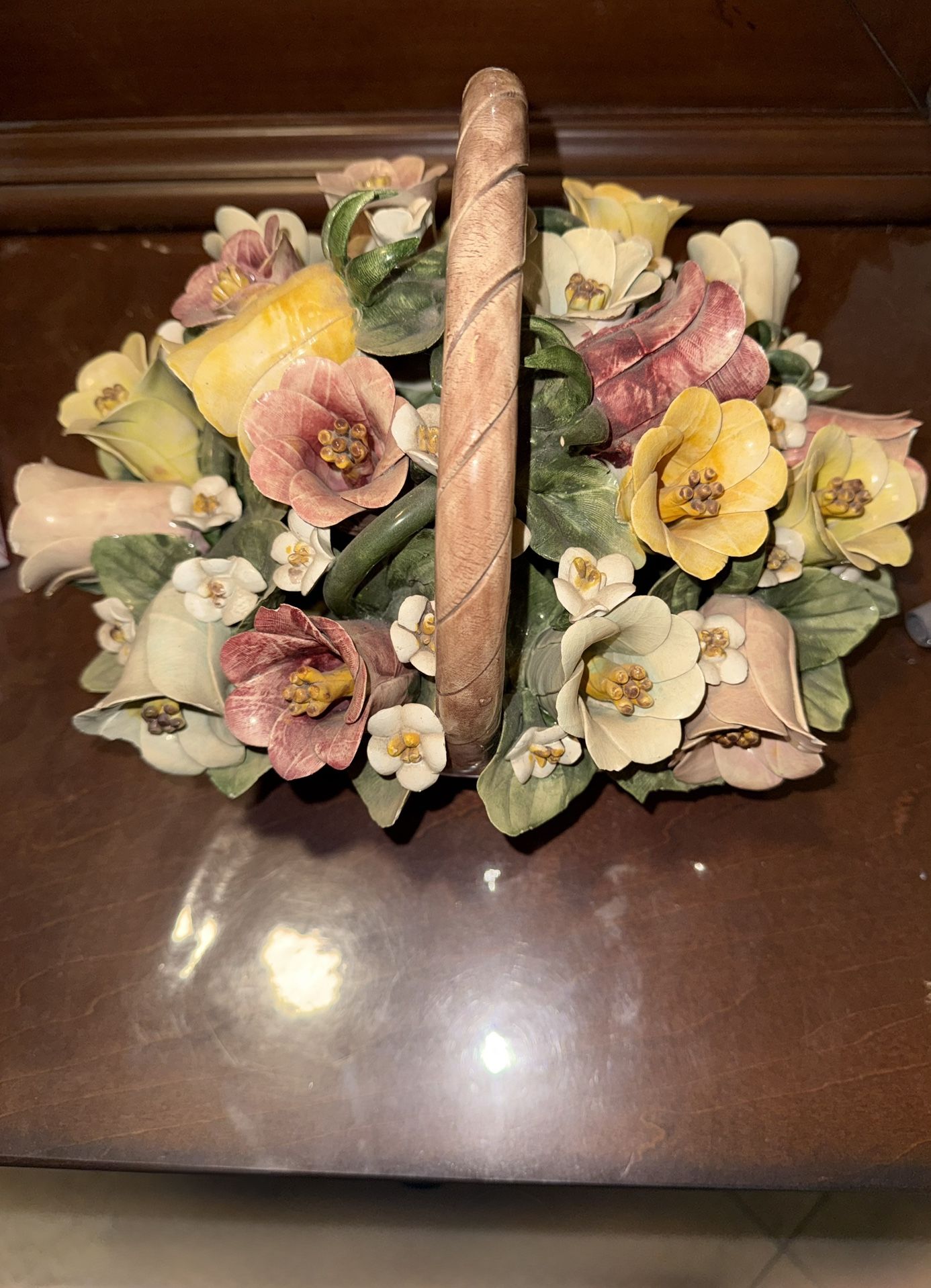 Vintage porcelain floral basket with hand-made flowers and leaves. Capodimonte-style design with pastel colors and detailed craftsmanship. Decorative piece only (not functional basket). Clean vintage condition with no obvious damage. Great display item for home décor or collectors.