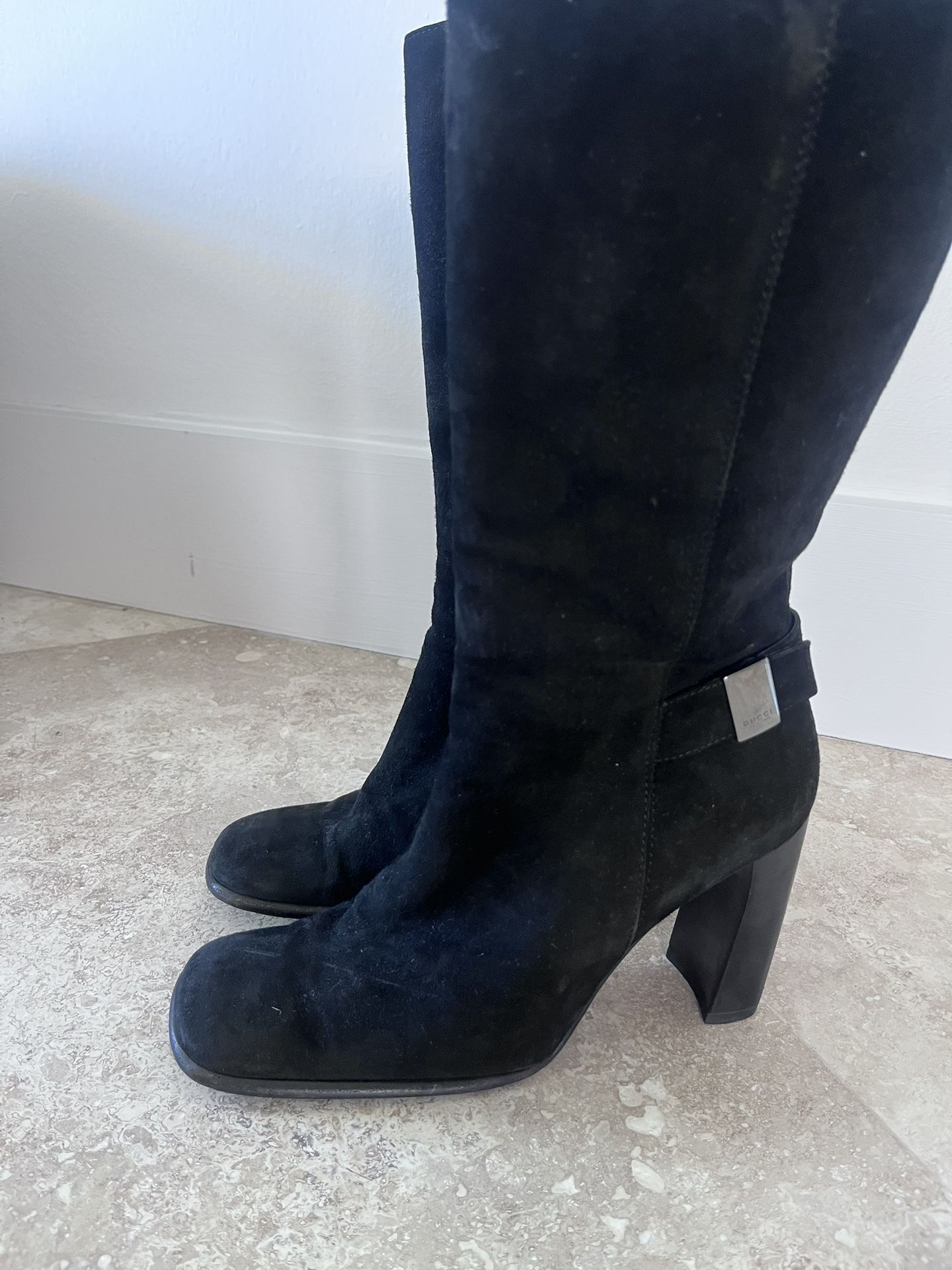 Gucci black suede boots in great condition. Size 38, 3.5” heel height, zipper on side, boots height 13.5”.
