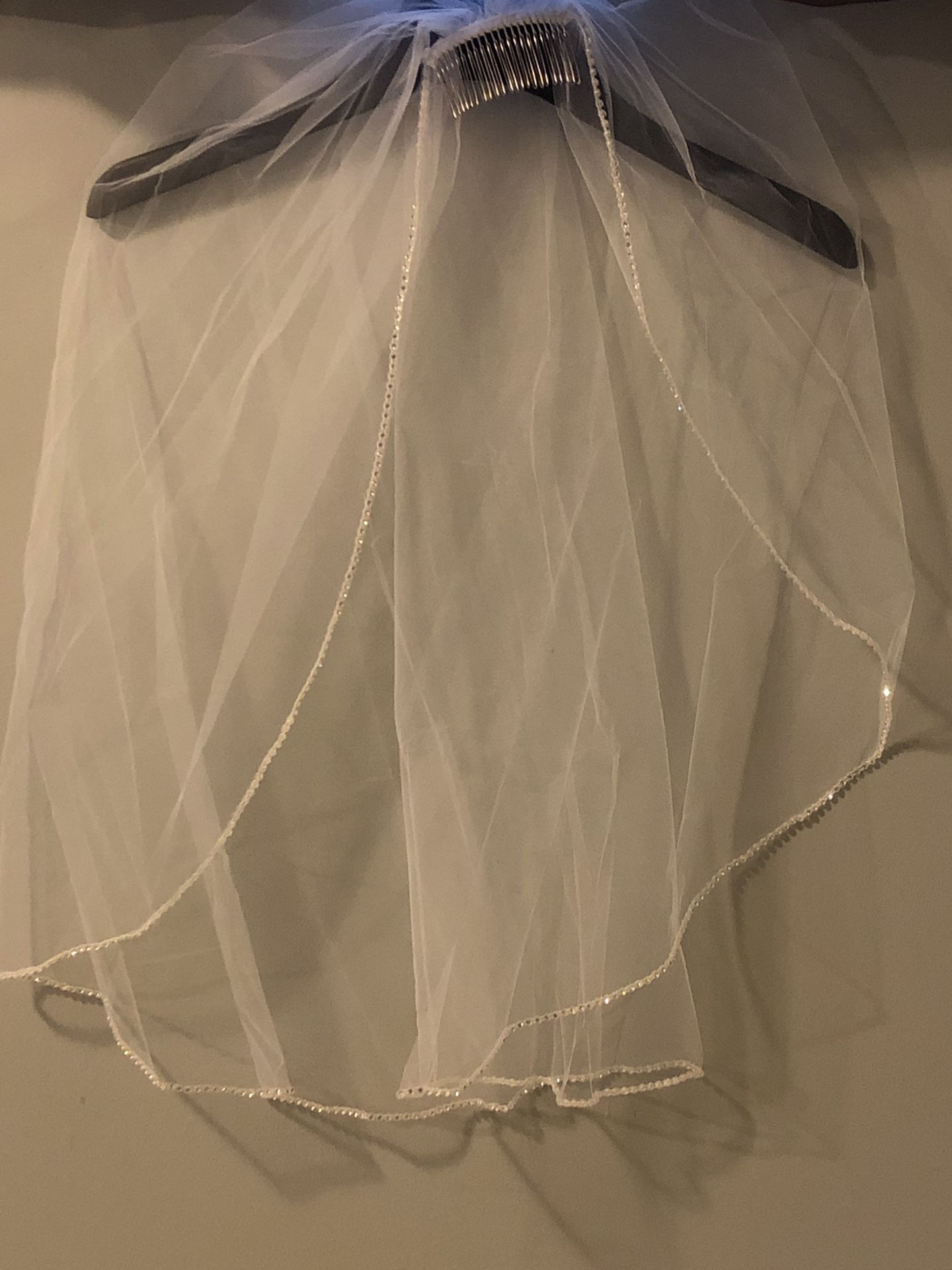 BEAUTIFUL!!! White Bridal Veil, 1Tier Elbow Length (30”) Has rhinestones along the edge all the way around the veil. The comb is silver. The veil is brand-new, never worn. It was only taken out the packaging to take pictures of it.