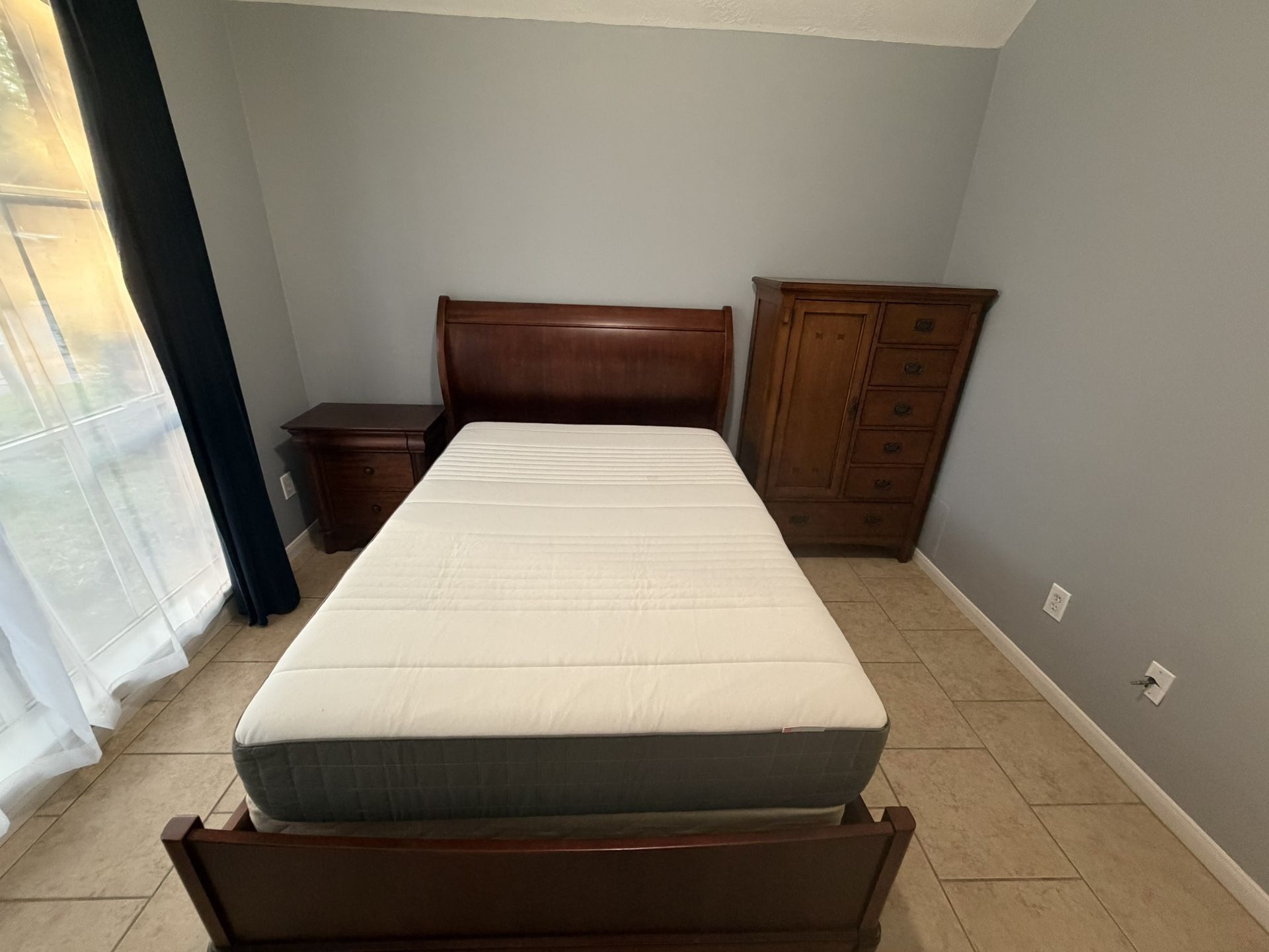 Solidwood premium quality bedroom furniture set including bed frame with board, full size mattress new condition, night stand, chest, and mattress (new) furnitures barely used almost like new