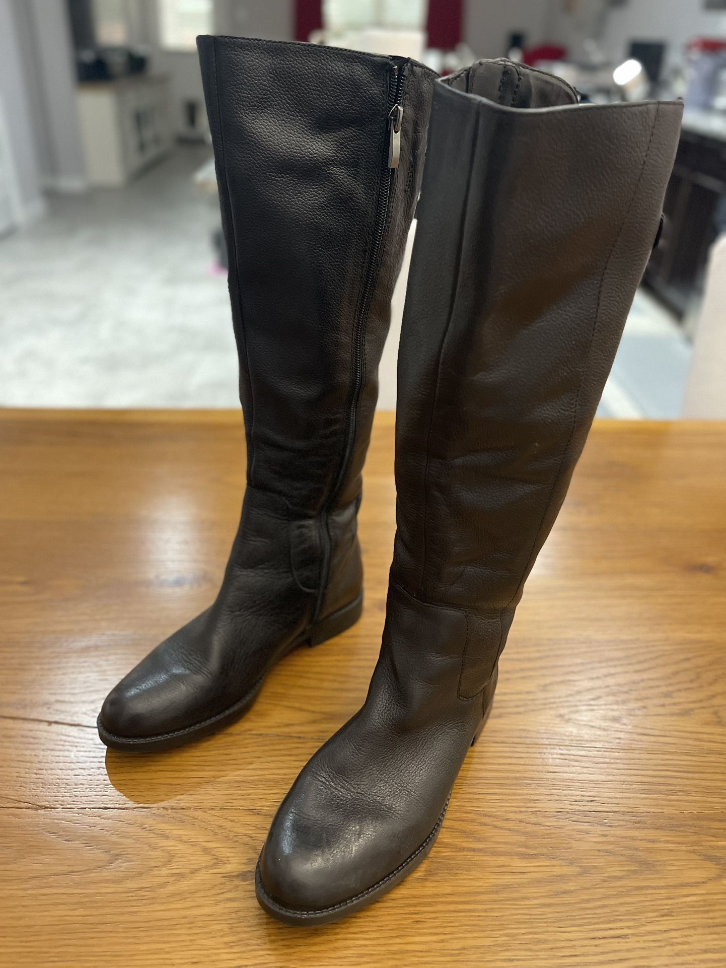 Like new without box Franco Sarto tall riding boots. Real leather material in excellent condition. Worn only inside the house. No scratches and damages. 16.5” high and 5.5” diameter but stretchable around the calf. Length is too high for me. Retail value is $120. Marbach/1604