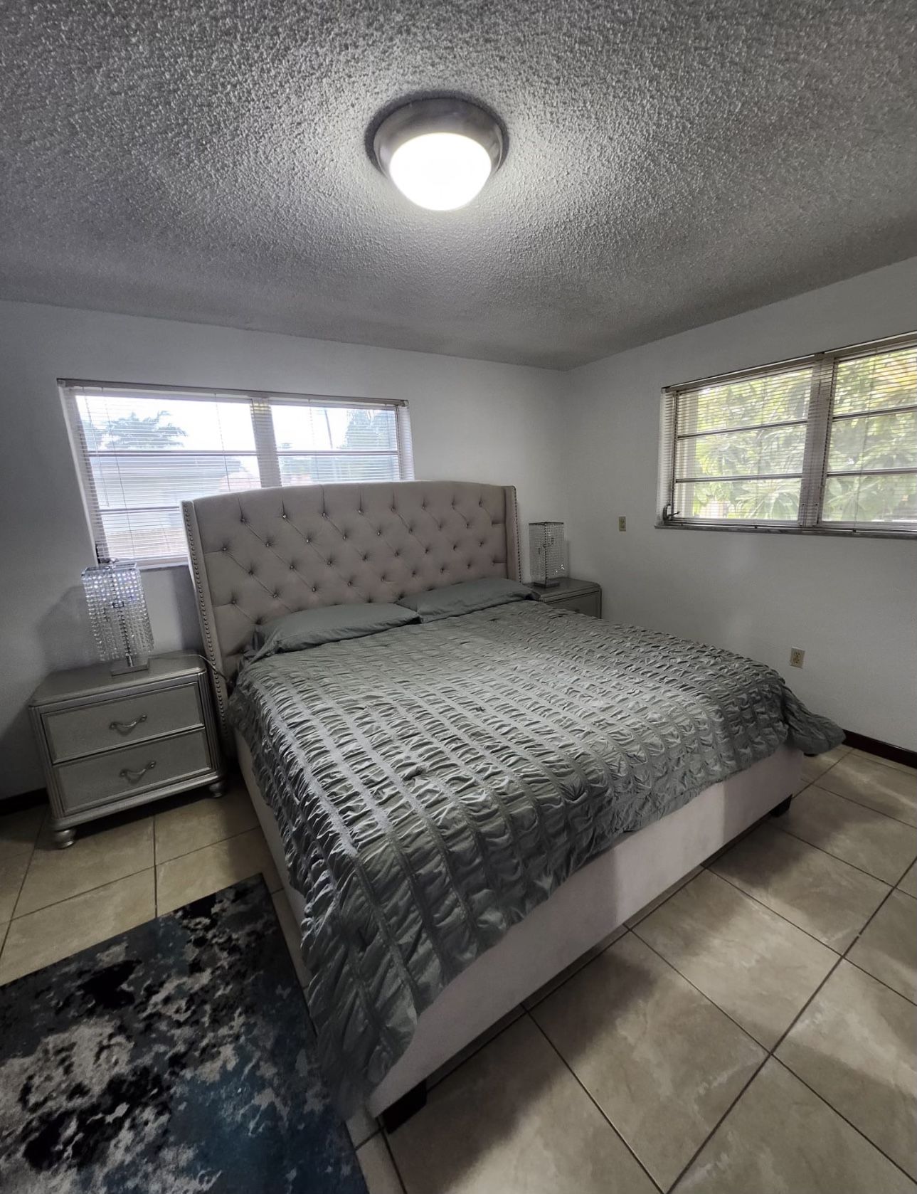King Bed Frame + Mattress + 2 Night Tables Bed dimensions 89”L x 85”W x 62.5”H Table dimensions 18”L x 29” W x 28” H All included in the price. Can also be sold separately.