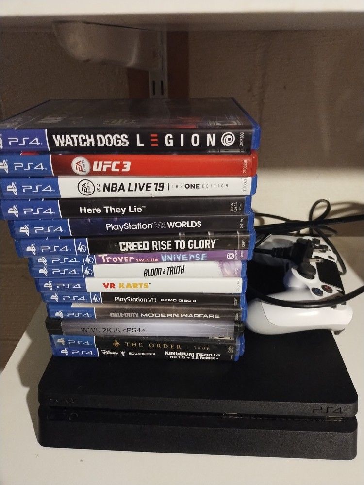 Selling a PlayStation 4 Slim in good working condition. Clean, tested, and ready to play. Includes: PS4 Slim console 1 official DualShock 4 controller 14 PS4 games, including: Call of Duty: Modern Warfare Watch Dogs: Legion Kingdom Hearts HD 1.5 + 2.5 Remix UFC 3 NBA Live 19 WWE 2K16 The Order: 1886 Plus PlayStation VR games (VR headset not included) Console runs great, no issues. Games are in good condition. Pickup preferred. Cash only. Message me if interested. $250 obo, no trades.