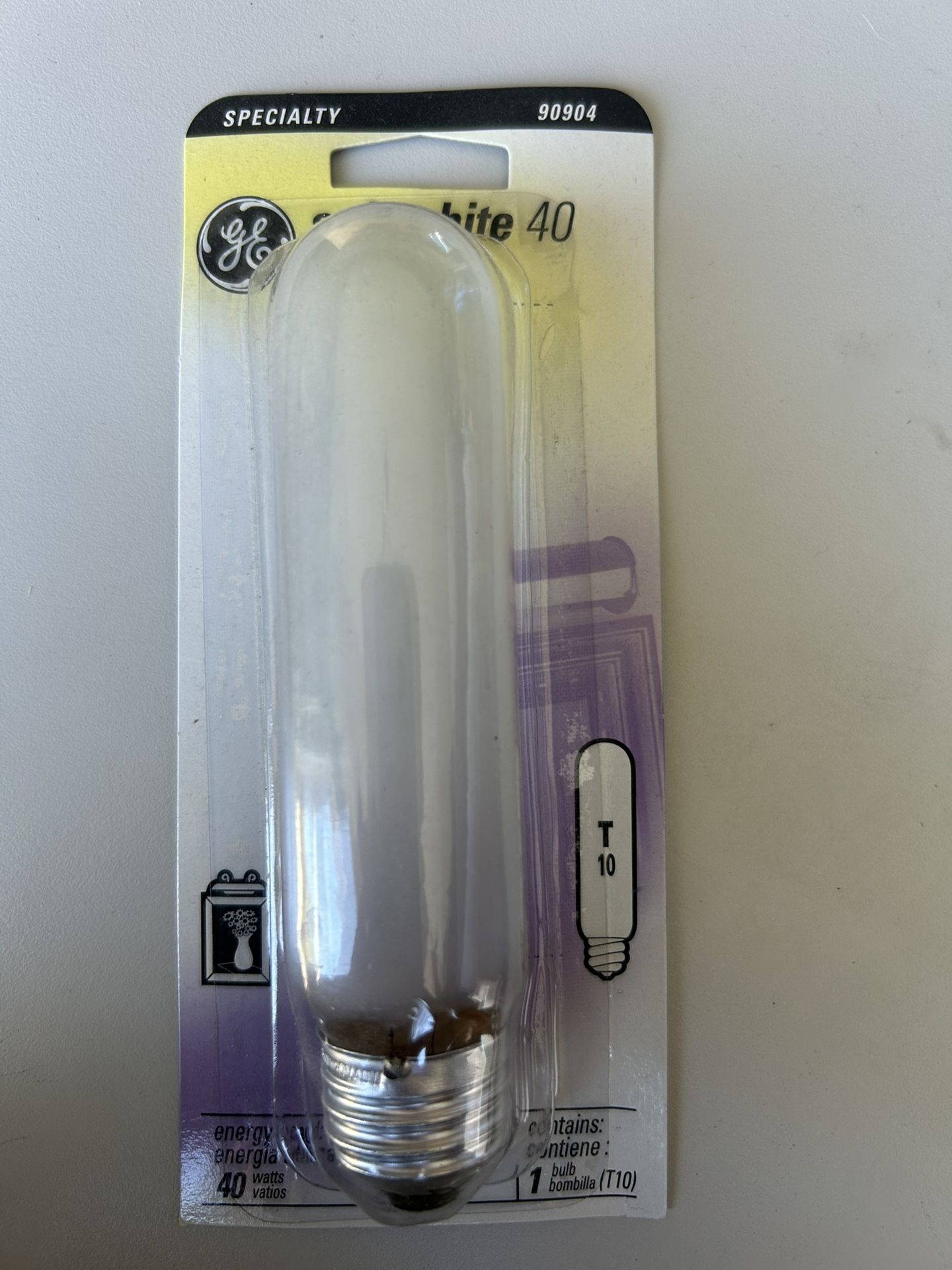 5 pcs in a Box! $5 each Brand GE Condition New Width 3.870 Watts 40 Color type Clear Product description GE, 40T10, 40W, 120V. Clear, Tubular Light Bulb, Maximum Overall Length 5-5/8", Medium Base, 420 Lumens, 1000 Hours. General Electric 40-Watt Crystal Clear Incandescent light. Color temperature rating of 2500 K. Incandescent lamp will provide up to 0.9 years of use on average. Provides approximately 420 lumens of light, illuminating your environment around you. Works with most 120-Volt lighting fixtures. Incandescent lighting is commonly used for decorative, office, residential, and special purpose lamps. Light is well suited for most Specialty lighting applications. Using the 40-Watt Incandescent lamp provides about 1000-hours of rated running life, which means replacing your bulbs less often.