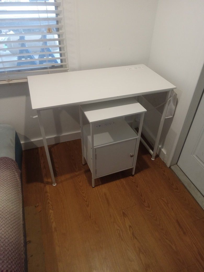 Matching set little nicks here and there.But everything works properly.Both have charging ports.Desk has a pouch on the side for your notebooks , pens , pencils , etc. Asking $ 35