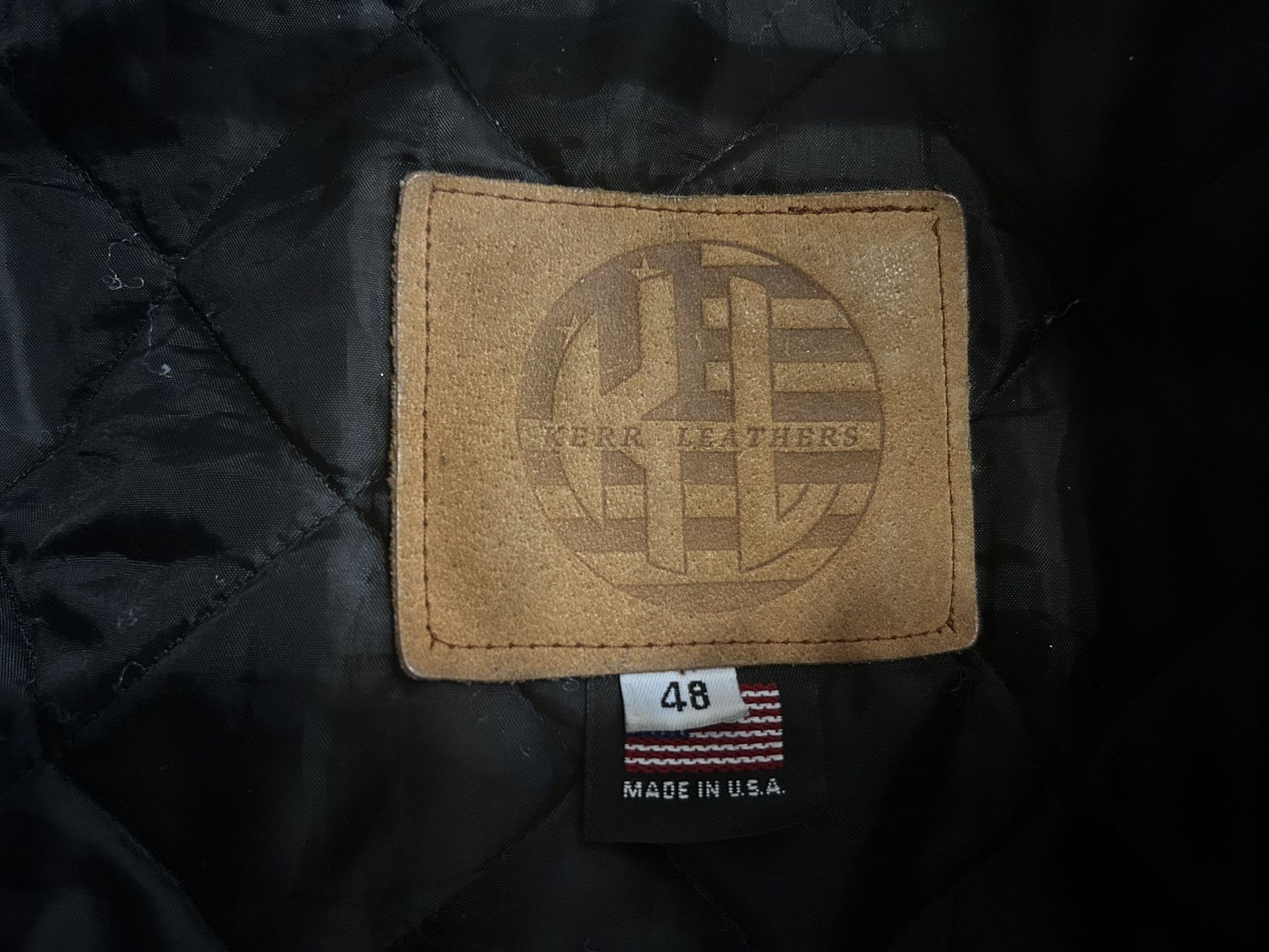 Authentic Kerr Leathers motorcycle jacket featuring original Harley-Davidson HOG (Harley Owners Group) patches, including 2000 HOG and Los Angeles Area #1 Chapter. Made in the USA, size 48. This jacket has zippered front pockets, a zippered chest vent with perforated airflow underneath, and custom concho zipper pulls. Features zippered sleeves with reinforced leather elbow patches for durability and comfort. Includes a zip-in inner liner and an interior zippered pocket. Details: • Kerr Leathers • Genuine Harley-Davidson HOG patches • LA Area #1 Chapter & 2000 HOG patch • Zippered chest vent with airflow perforation • Custom concho zipper pulls • Zippered sleeves with leather elbow patches • Zip-in liner + inside zip pocket . Lace sides • Size 48 • Made in USA