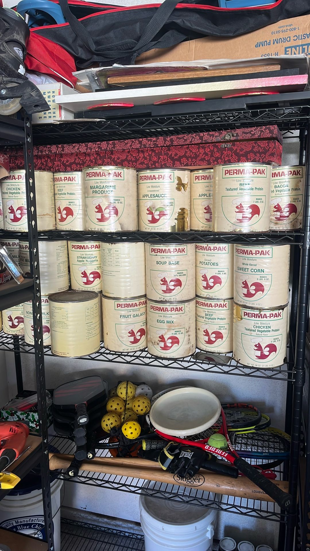 I’ve had this food storage in my garage for years. There’s about 40 cans or so of food storage. Opened one up a while back. It was still good. Yours if you want it.