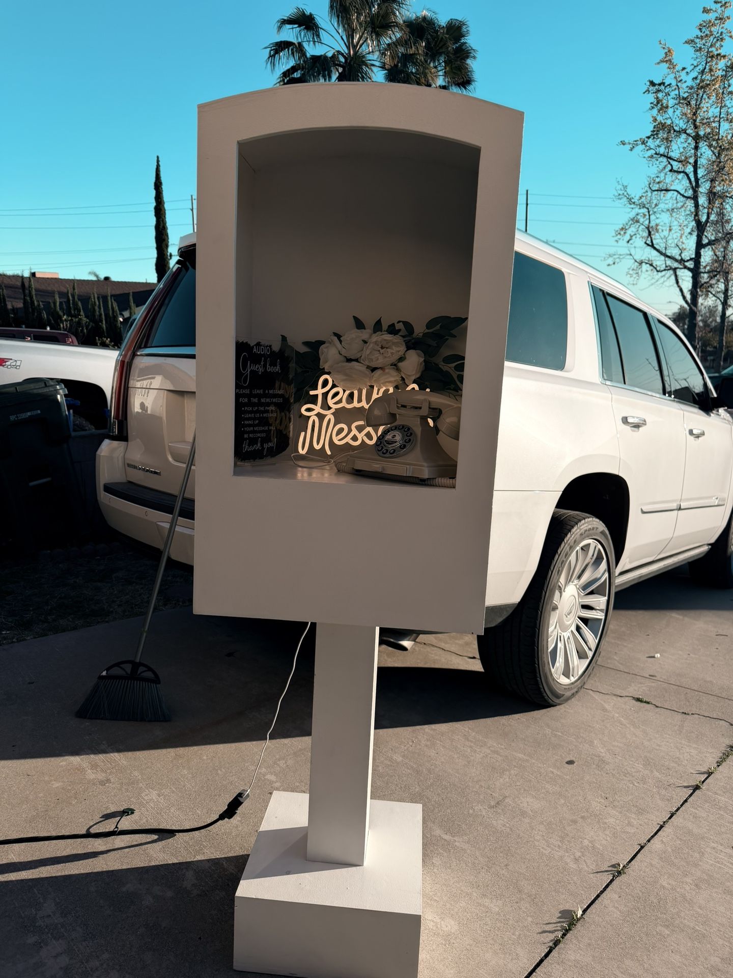 Great add to your party rental business. Separates into 3 pieces fits into a trunk of a car. Can be ran off batteries or extension cord. Records messages to for the host, at the end of the night you just hand over an SD card with all the messages. New paint with clear coat on it for easy cleaning.