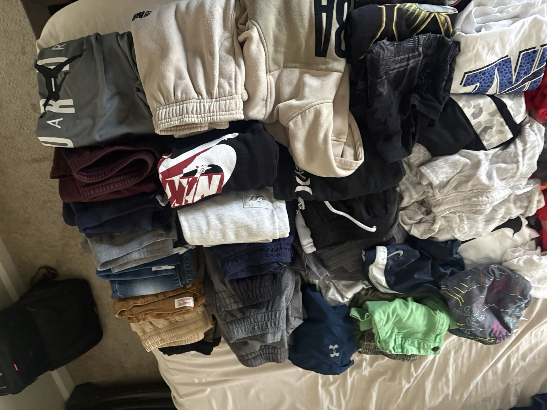 13 sweat pants,2long pants,10shorts pants, 21shirts,1 long sleeves,2sweaters and 1short sleeve.good brand. Well care clothes.50 total of boys clothes. $100 for all if you calculate will be like $2 a piece for a good brand.