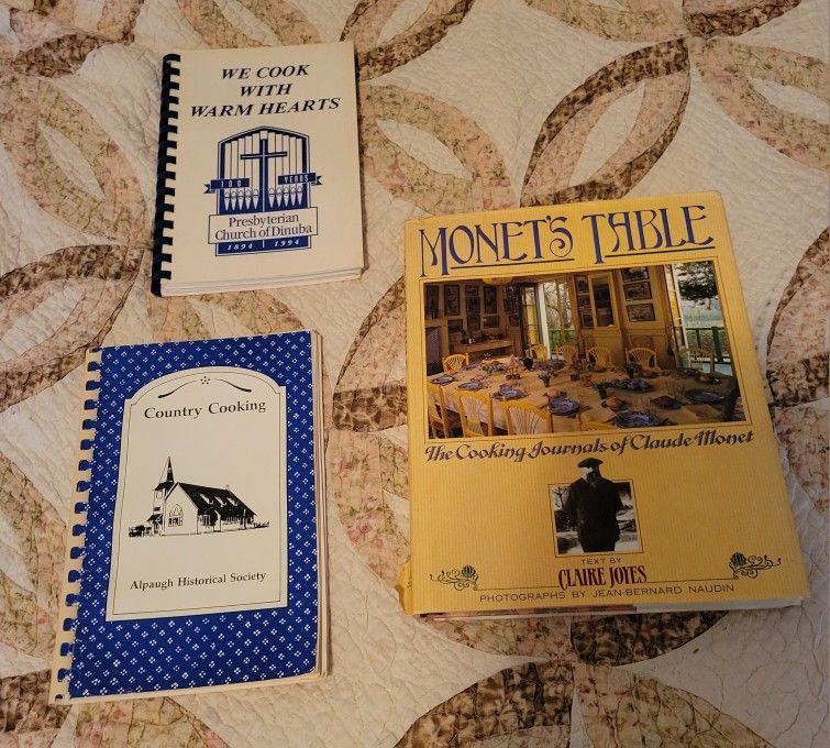 3 unique cookbooks. Two are from local fundraisers, and one beautiful Monet cookbook. All cookbooks have unique recipes from the local area. Monet cookbook has a beautiful display of the artist's house, tablesetting recipes, and a slice of his personal life. All three books are worth more if sold separately. A god deal $30 Cash in person.