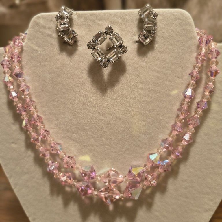 These are all vintage pieces from the 1950's. The Brooch and Earrings are made and signed by Weiss and are made from Austrian crystals. The pink Aurora Borealis glass beads are diamond shaped and double strand. Absolutely beautiful and stunning.
