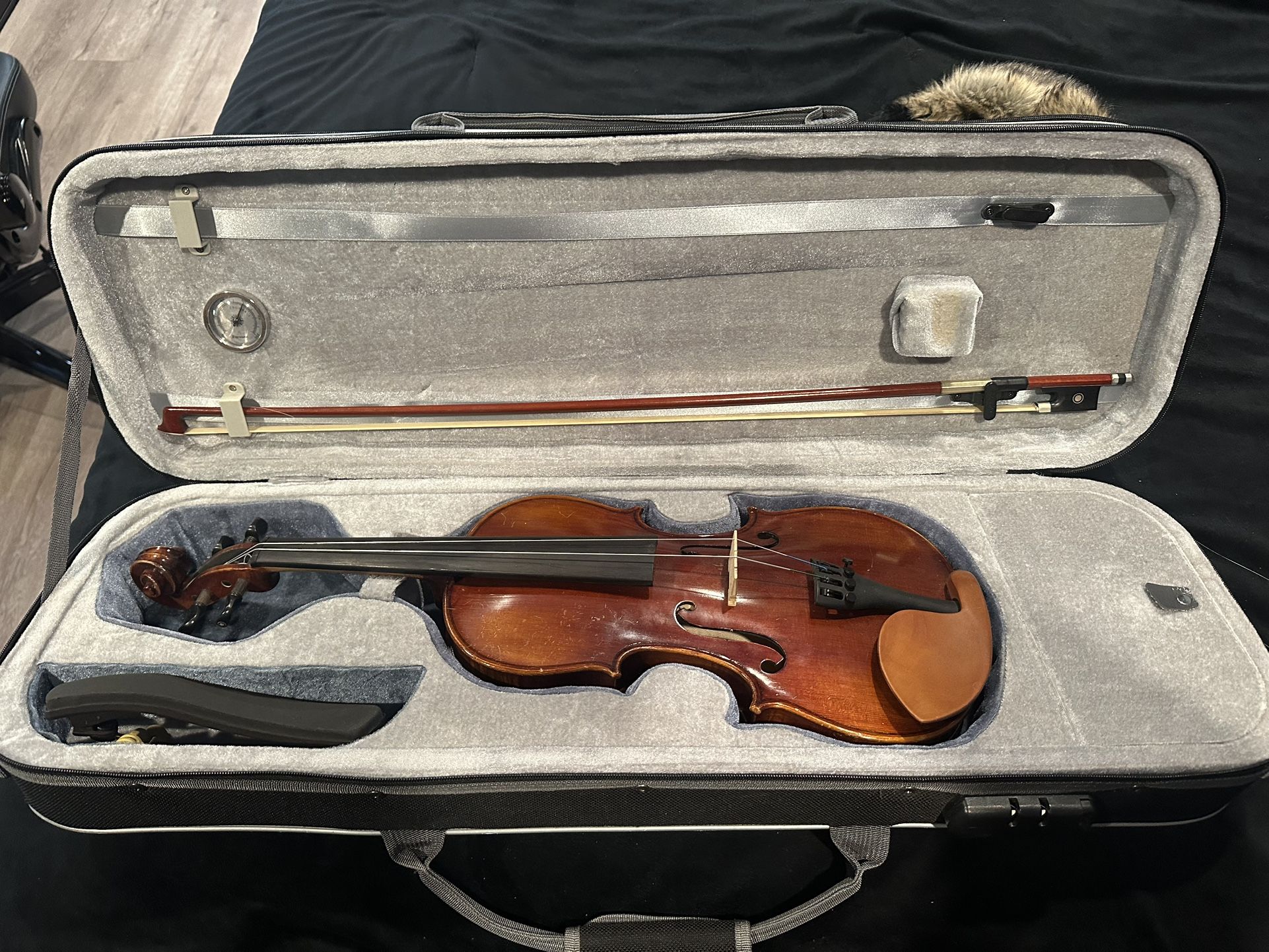 500$ violin 2 strings missing but includes bow, chin guard, and bow wax
