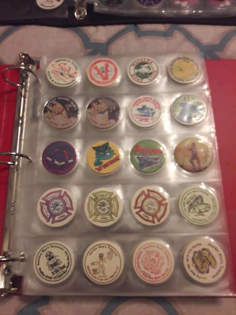 200 original POGS bottle caps, in sleeves, and binder, 1993, ALL COMPANIES INVOLVED in HAWAII.