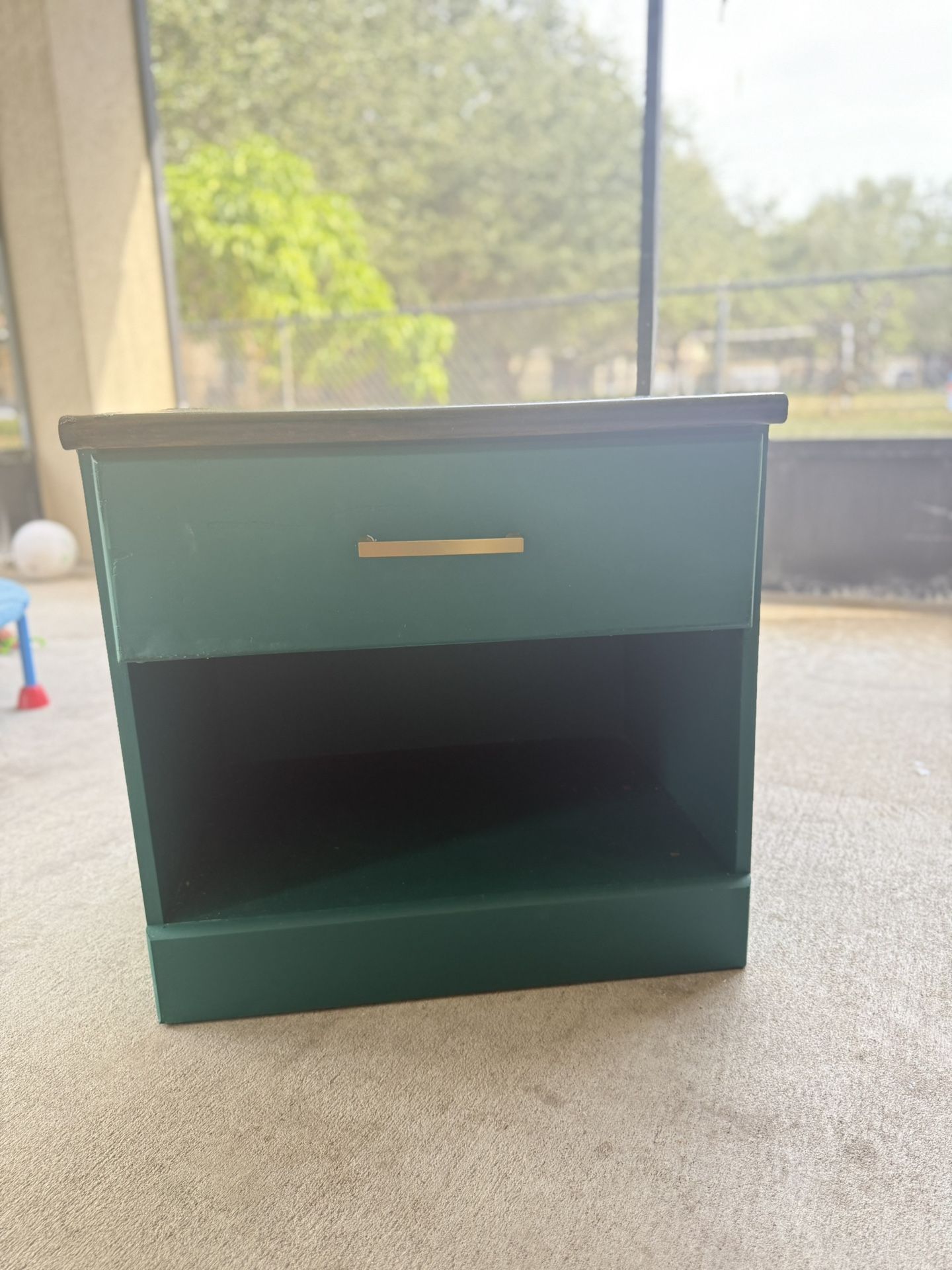Beautiful Dark teal/seafoam Blue End table/night Stand With Dark Mahogany stain top. Drawer with beautiful gold handle added as well as inside decor. One of a kind.