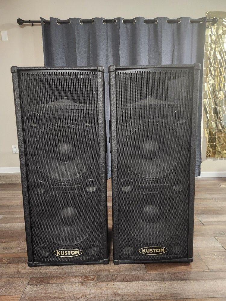 Kustom KSE-215H passive full range speakers. Two 15" woofers with horn high. Very good condition. The price is for the pair. Amplifiers are available, pls see listing or message me.