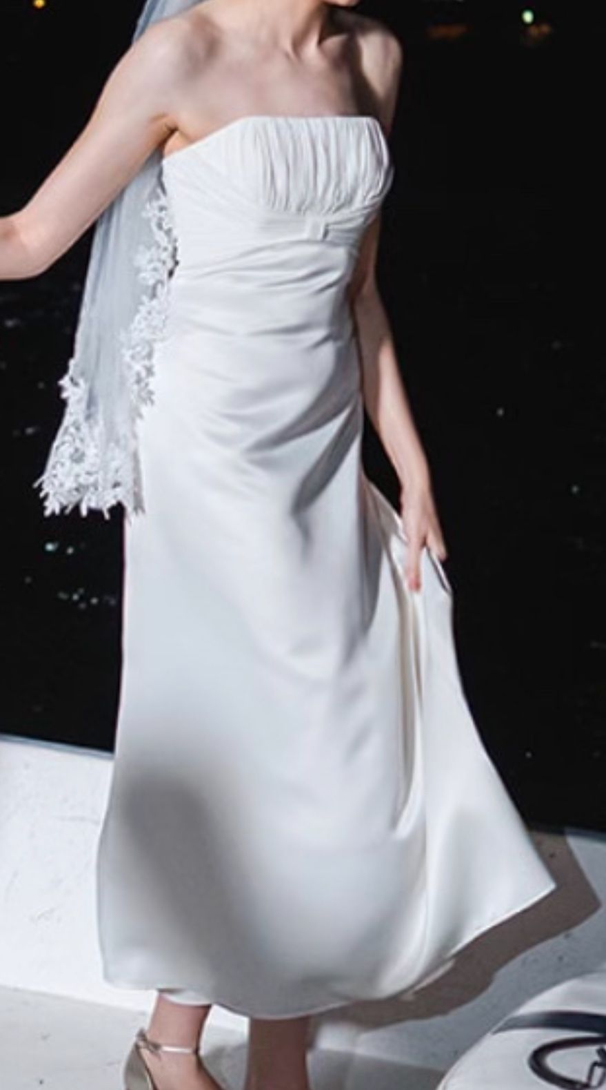XS Strapless off white satin wedding dress short train