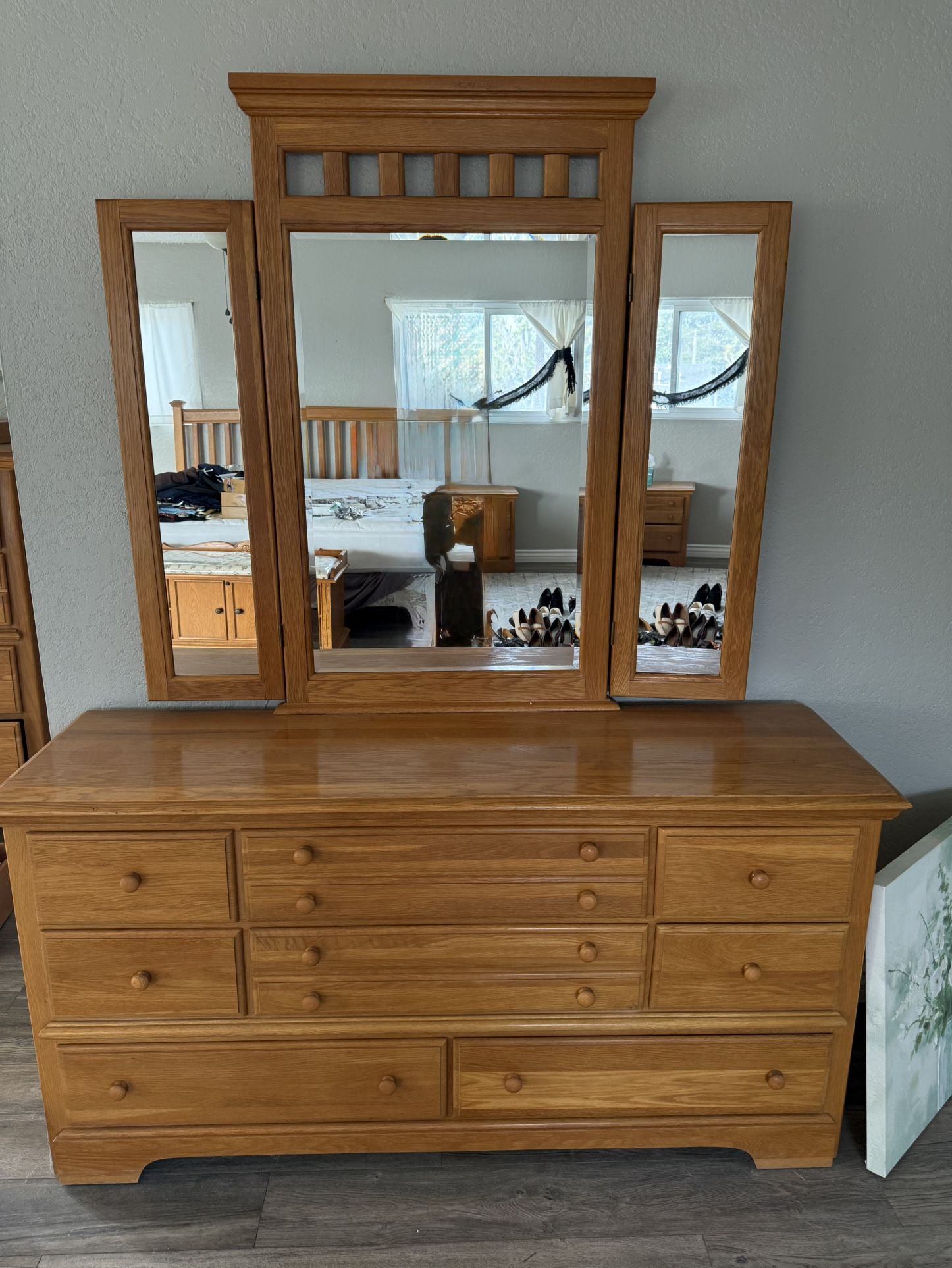 Beautiful solid wood dresser with attached tri-fold mirror. Very clean, sturdy, and well maintained. Plenty of drawer space and classic design that fits most bedroom styles. All drawers function properly and mirror is intact. Ready to use. Heavy — bring help.