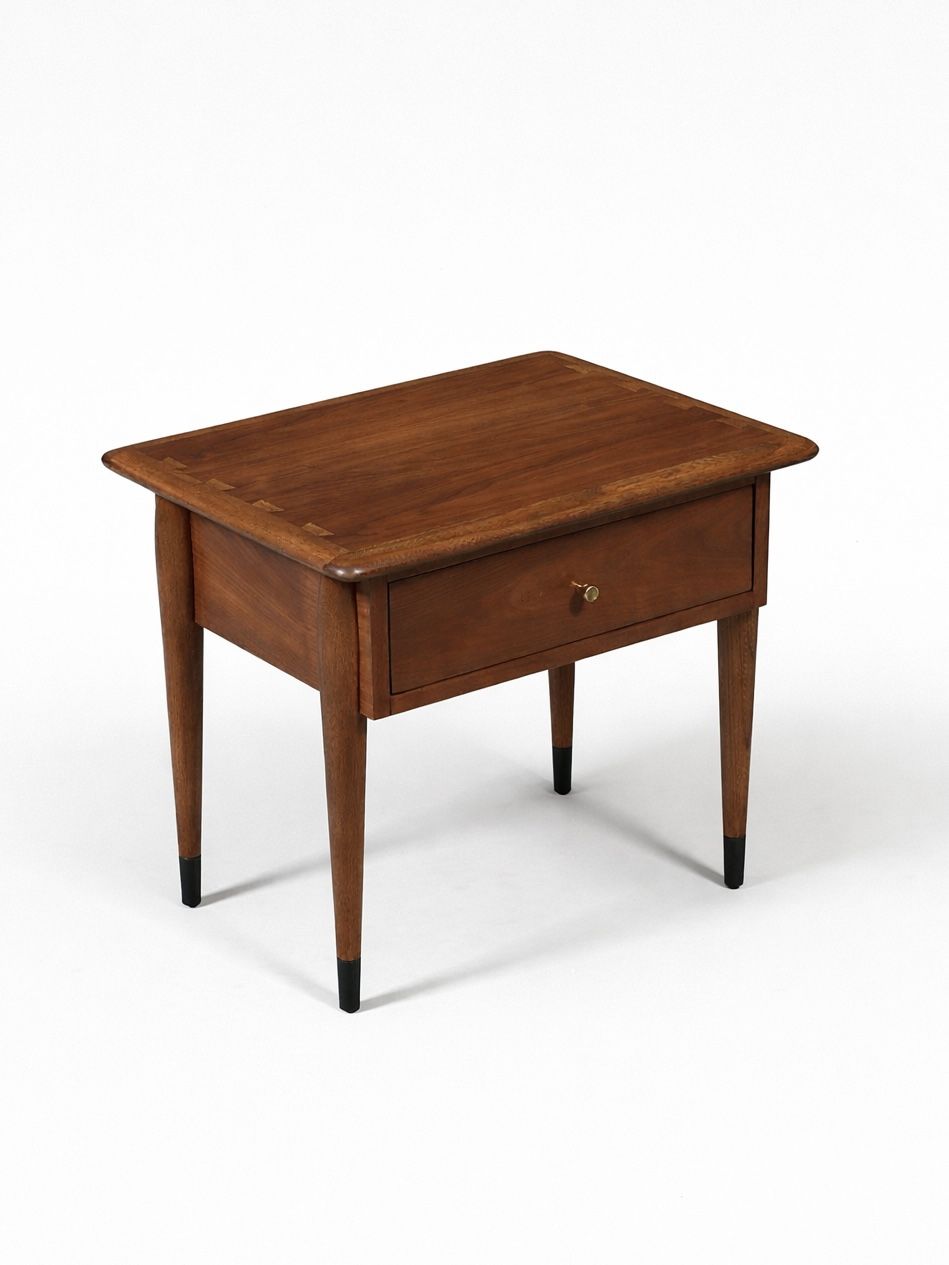Designer: Lane Manufacturer: Lane Country: United States Materials: Walnut Style: Mid-Century Modern Year: 1960's www.vintagesupplystore.com Delivery available for a fee. Enjoy flexible monthly payments with Paypal. Choose your installment plan on our website. $795 - Condition: Expertly Refinished Dimensions: 20”H x 24”W x 17”D Stop by our new showroom located at 5450 E. Olympic Blvd. Los Angeles, CA 90022 Open by appointment but very flexible Instagram: vintage_supply This Mid-Century Modern “Acclaim” walnut nightstand by Lane, crafted in the United States during the 1960s, is a beautifully balanced example of thoughtful American design. The piece features Lane’s signature dovetail inlay detailing along the top corners, paired with sculpted tapered legs and subtle brass hardware that add warmth and character. Constructed from rich walnut it offers a rich grain pattern and a timeless silhouette that works seamlessly in both modern and traditional interiors. A single smooth-gliding drawer provides practical bedside storage while maintaining the clean, architectural profile. This nightstand has been expertly refinished, highlighting the wood’s natural depth while preserving its original design integrity. Fun Historical Fact Lane introduced the Acclaim line in 1959, marking one of the brand’s most successful transitions into Mid-Century Modern design. The collection became famous for its distinctive dovetail corner inlays, a decorative nod to traditional craftsmanship reinterpreted for modern homes. Acclaim furniture was produced well into the 1960s and became a staple in American households during the postwar design boom. Today, original Acclaim pieces are among the most recognizable and collectible works in Lane’s history. With over 15 years of experience, our workshop has followed a careful process of restoration, showcasing our passion and creativity for vintage designs that can seamlessly be incorporated with many interior decors. Enjoy! :)